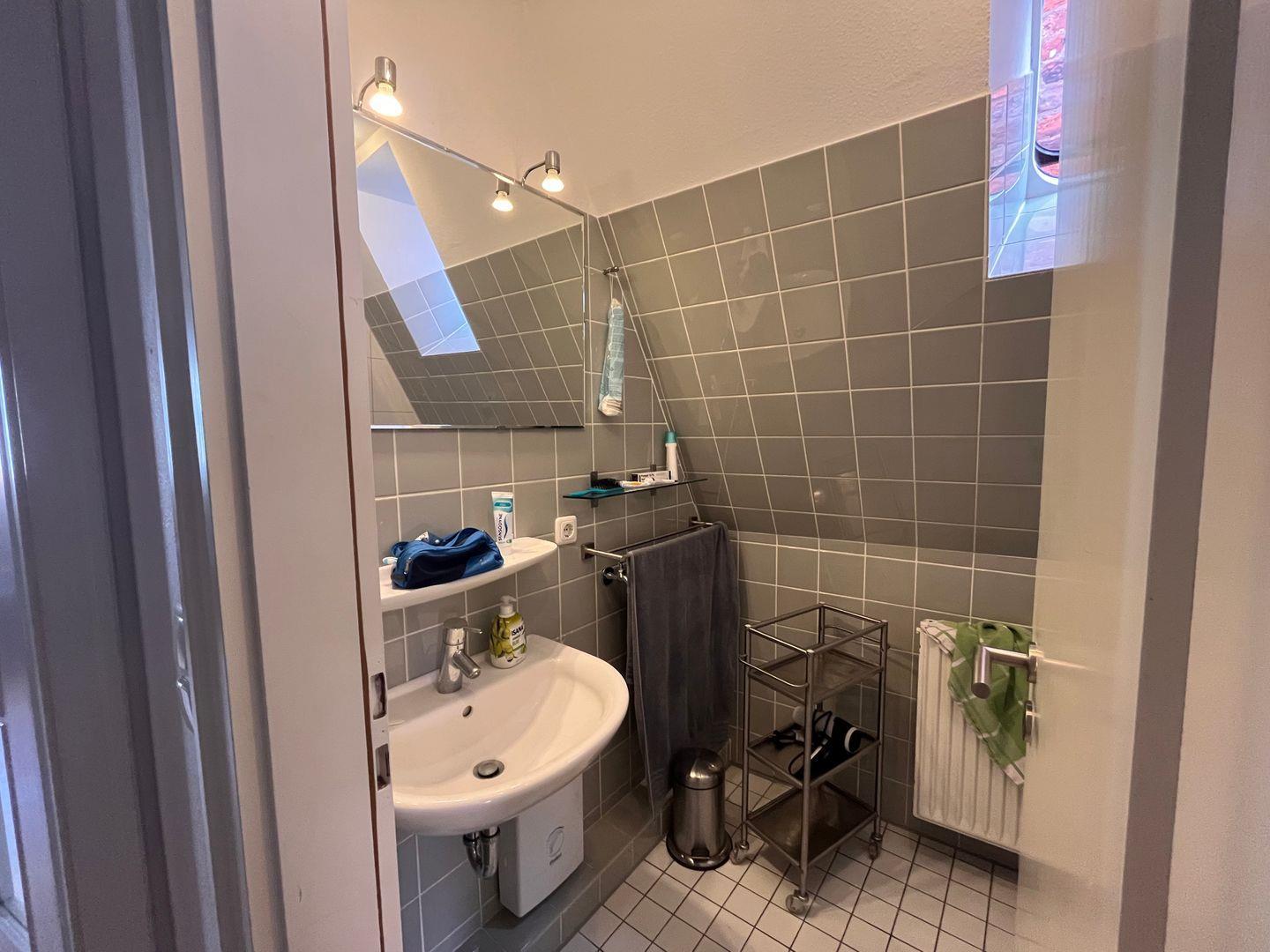 Das Badezimmer ist mit einer Dusche (mit Wanne), WC, Waschbecken, Spiegel und Haartrockner ausgestattet.