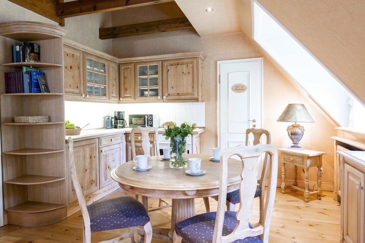 Die Ferienwohnung für vier Personen befindet sich im 1. OG in einem von zwei Kavaliershäusern innerhalb des Ensembles von Schloss Lüdersburg. Sie verfügt über ein großes Wohnzimmer sowie einen Essbereich mit voll ausgestatteter Einbauküche und gemütlichem Tisch für vier Personen.