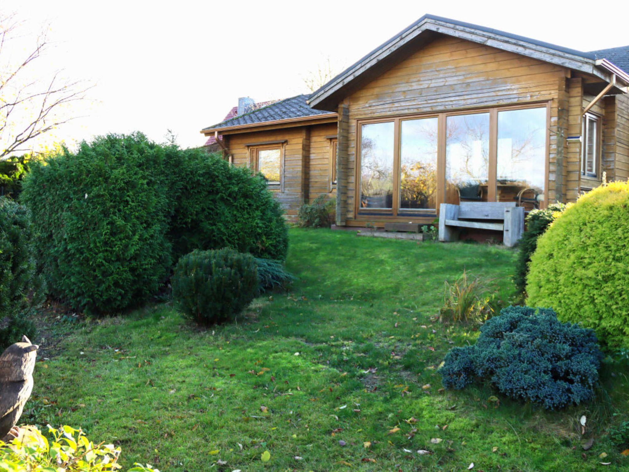 Rustikales Holzferienhaus in ruhiger Lage mit Blick auf Wiese, nahe Natur und Ostsee, ideal für Familien und Hunde.