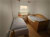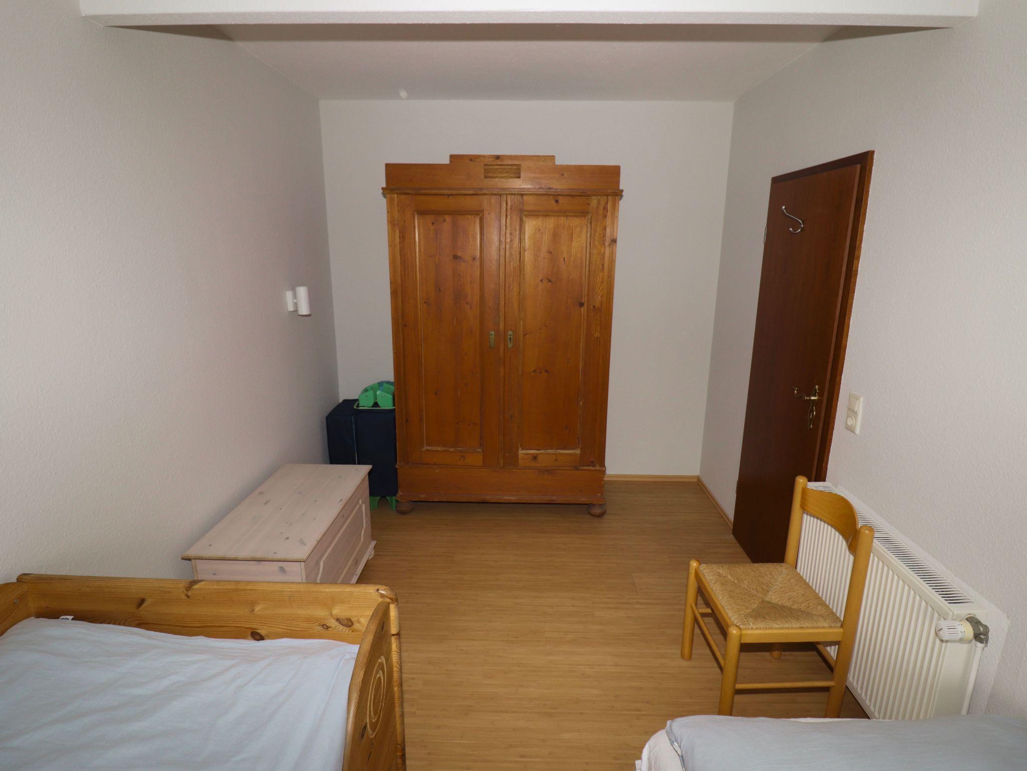 Im Kinderzimmer daneben befinden sich zwei Kastenbetten mit den Maßen 90 x 200 cm, eines davon mit Seitenteilen an drei Seiten und mit Schubläden ausgestattet. Weiterhin steht dort ein schlichter antiker Kleiderschrank des vorletzten Jahrhunderts aus geöltem massivem Nadelholz gearbeitet. In einer Holztruhe ist Kinderspielzeug untergebracht. Für Babys und Kleinkinder gibt es zwei der bewährten aufklappbaren Kinderbetten von 140 cm Länge und dazu passende separate Matratzen.