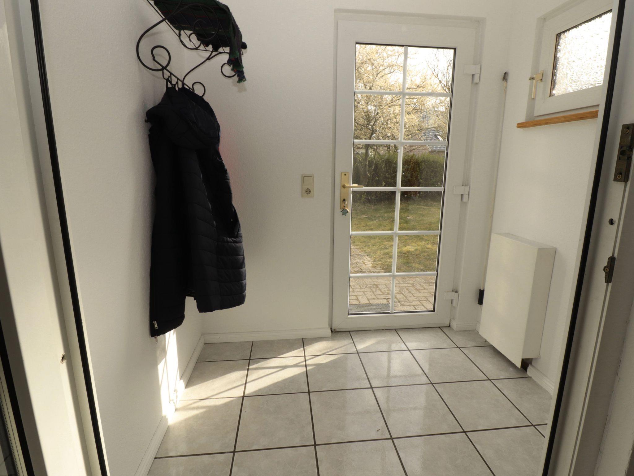 Man betritt das Haus über einen abgeschlossenen Windfang, der ausreichend Platz für Jacken und Schuhe bietet. Durch eine Terrassentür gelangt man in den gefliesten Wohnküchenbereich. Geradeaus führt eine offene Treppe in den Wohnbereich unter dem Dach und am anderen Ende des Raums befindet sich die Küchenzeile. Diese verfügt über einen Induktionsherd mit Backofen (eingebaut 2024), Kühlschrank mit integriertem Gefrierfach und einer Geschirrspülmaschine. Auf dem Ablageregal zur Rechten steht eine Kaffeemaschine, Wasserkocher und Toaster. In diesem Raum befindet sich weiterhin ein runder, ausziehbarer Esstisch mit fünf Stühlen und ein TrippTrapp Kinderstuhl, sowie ein Vorratsschrank unter der Treppe. Über eine Terrassentür links neben der Kochzeile gelangt man auf die Terrasse in Südlage,