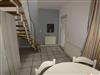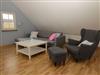 Im großzügigen Wohnbereich unter dem Dach steht ein runder massiver Holztisch mit modernen Kunststoffschalenstühlen und auch hier einem TrippTrapp Kinderstuhl. Für die gemütlichen Stunden findet sich hier ein Dreier-Sofa mit Recamière und ein einzelner Ohrensessel mit Sitzbank. Diese Möbel sind mit zeitlosem grauen Sofastoff bezogen und mit bunten Kissen aufgefrischt. Mit dem Flachbildfernseher, der an einem Dreibeinstativ befestigt ist, werden zahlreiche Sender per Satellitenantenne empfangen.
