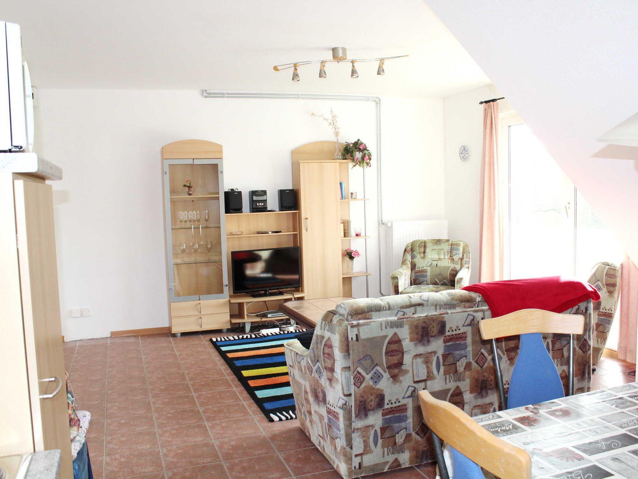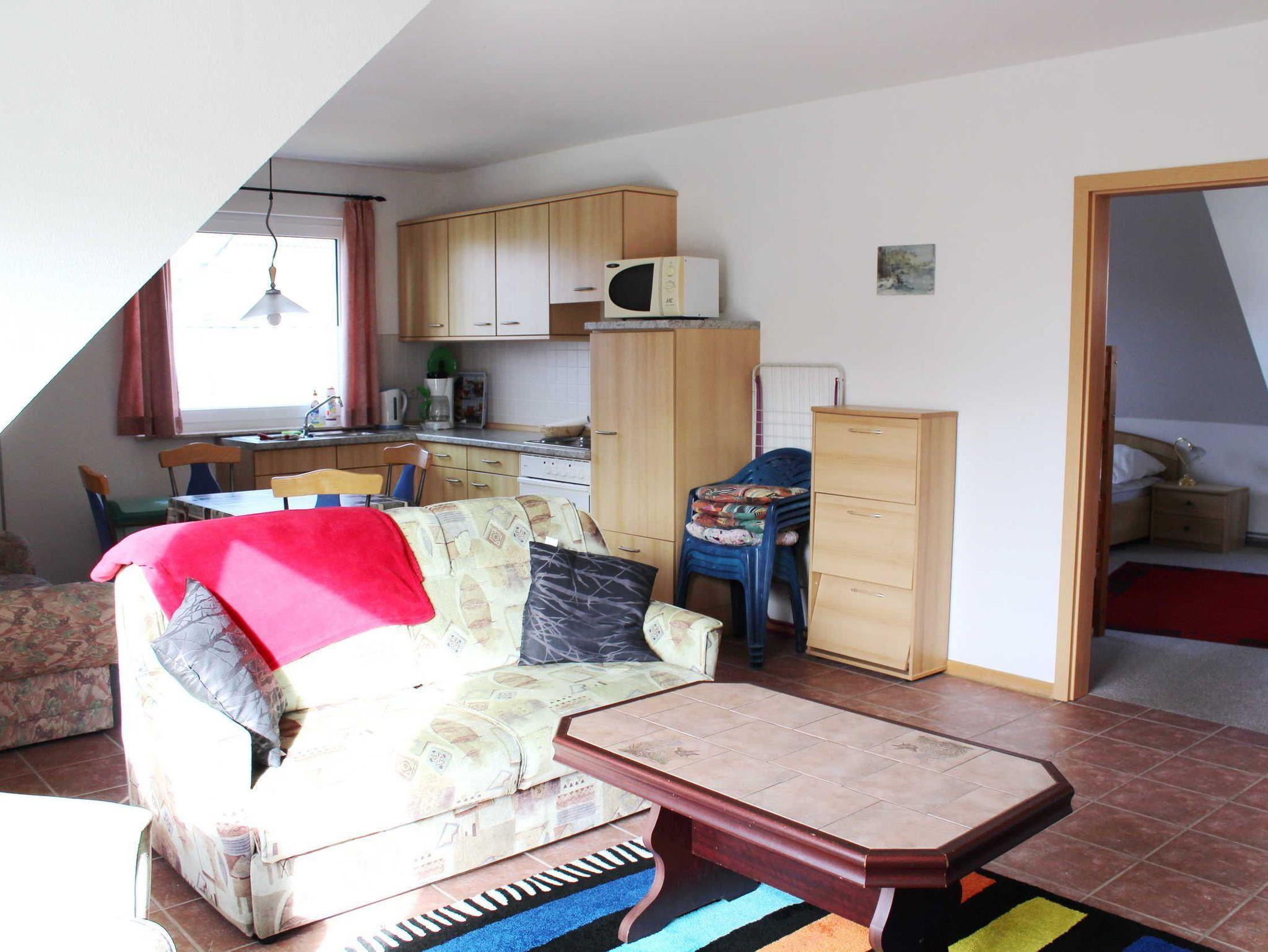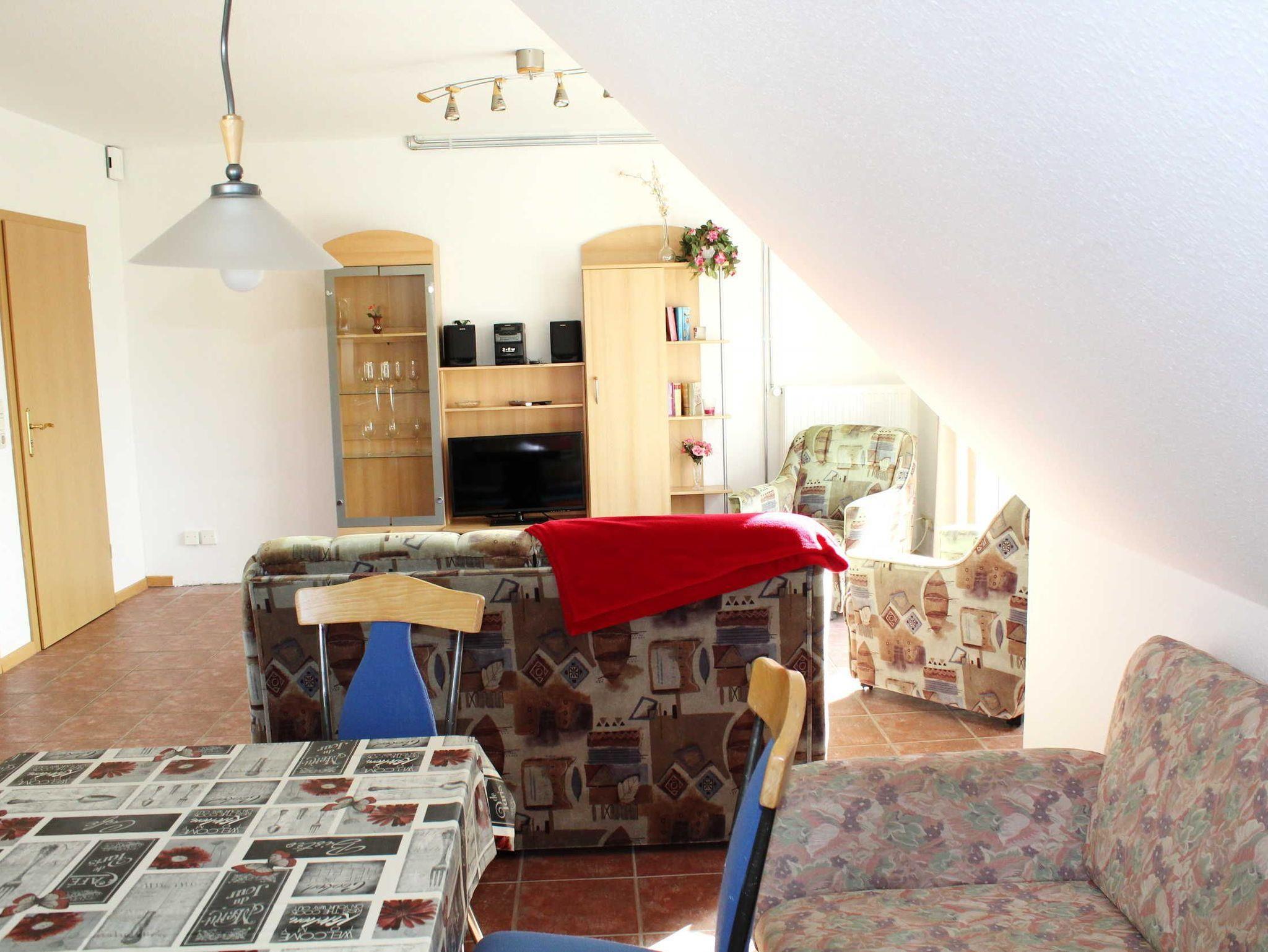 Die Ferienwohnung befindet sich im Haus 3 in der oberen Etage auf der rechten Seite. Sie ist modern ausgestattet und besteht aus einem Wohnraum mit Rundcouch(ausziehbar), Stereoanlage, TV und Sitzgruppe, einem Schlafzimmer mit Doppelbett, einer komplett ausgestatteten Küche und einem Bad mit WC und Dusche. Haustiere sind erlaubt (10,00 Euro/pro Tag). Endreinigung, Heizung, Wasser und Strom sind inclusive. Anreise ab 14.00 Uhr, Abreise bis 10.00 Uhr.