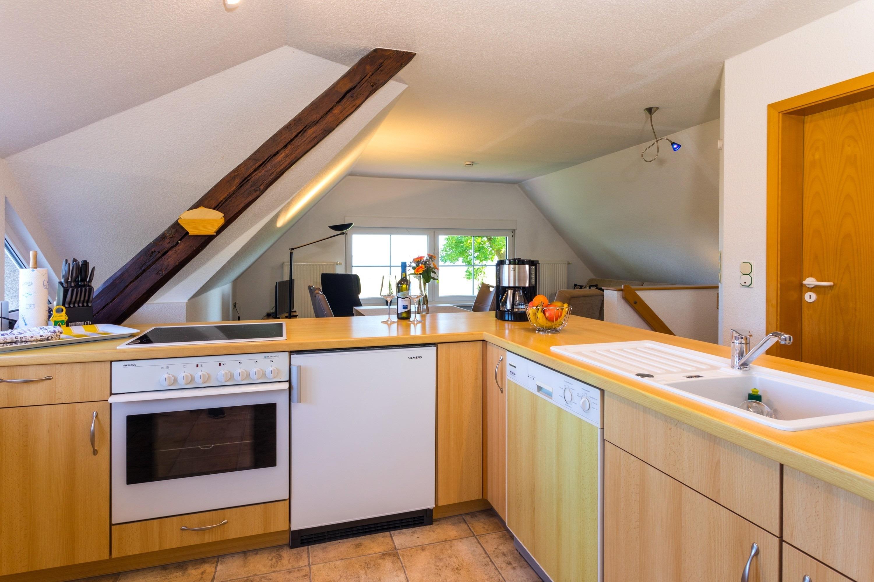 Die Ferienwohnung hat 2 Schlafräume und kann mit bis zu 4 Personen bewohnt werden. Integrierte mod Küchenzeile und große Essecke.