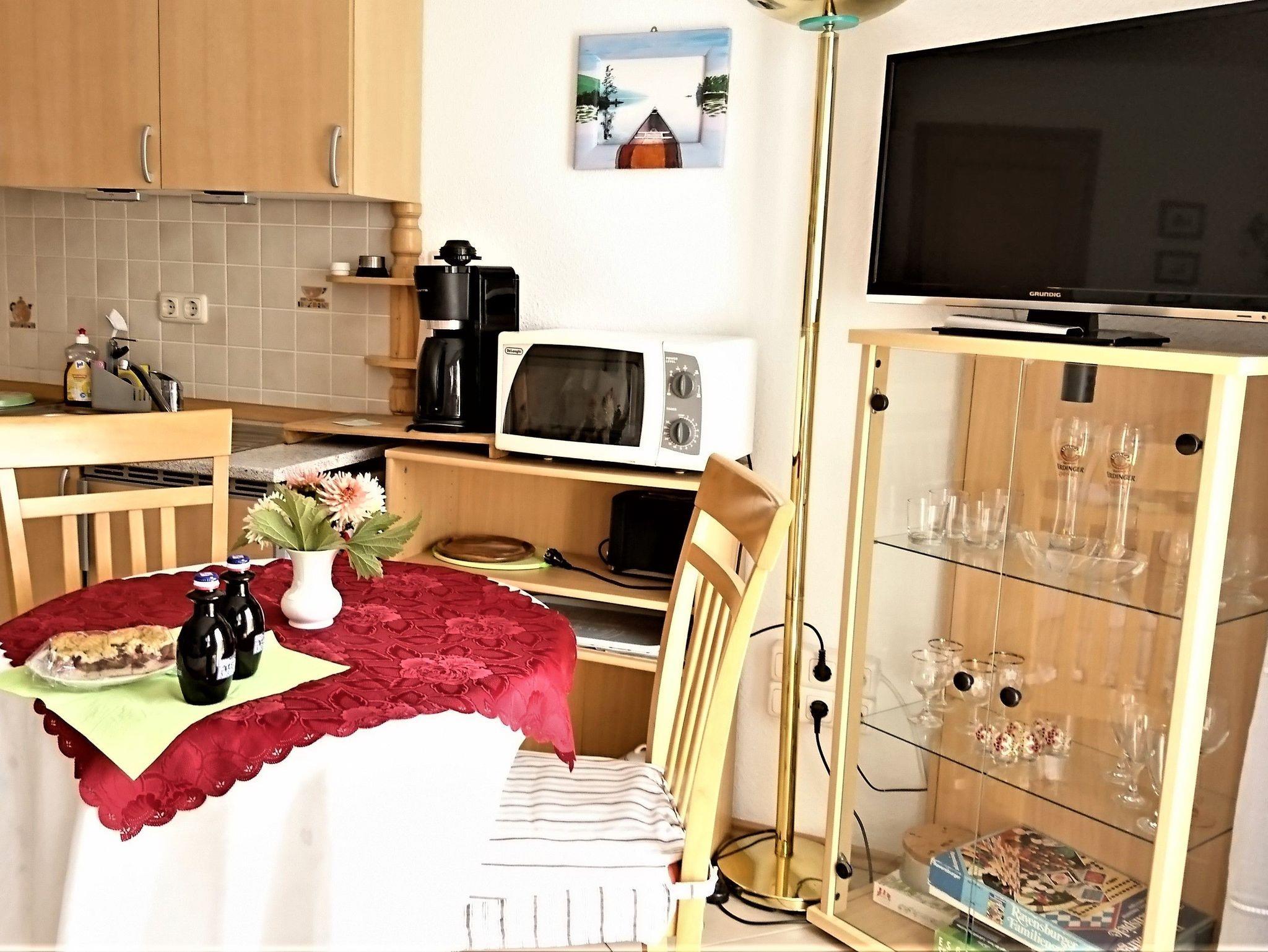 Kombinierter Wohn-Schlafraum (1 Aufbettung durch Schlafcouch möglich), Pantryküche (2-Plattenherd), Kühlschrank mit Gefrierfach, Mikrowelle, Kaffeemaschine, Eier- u. Wasserkocher, Sat-TV, Radio mit CD-Player, Wecker, Du/WC, Fön,