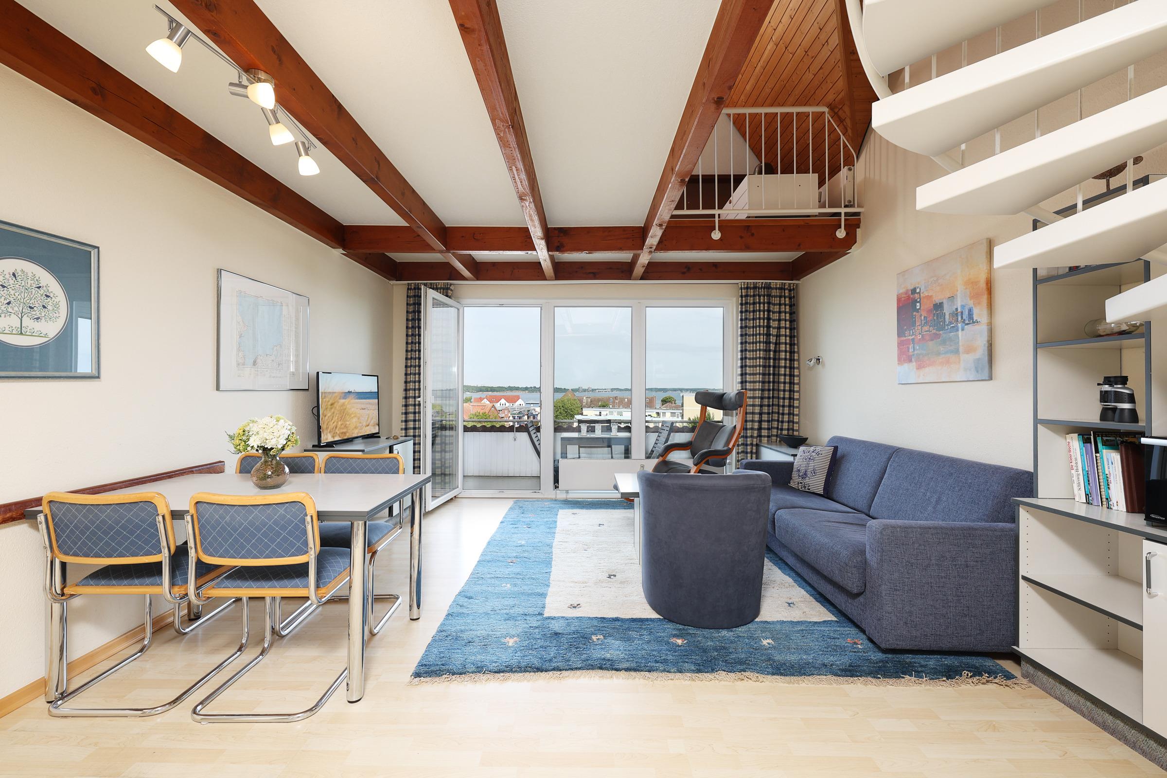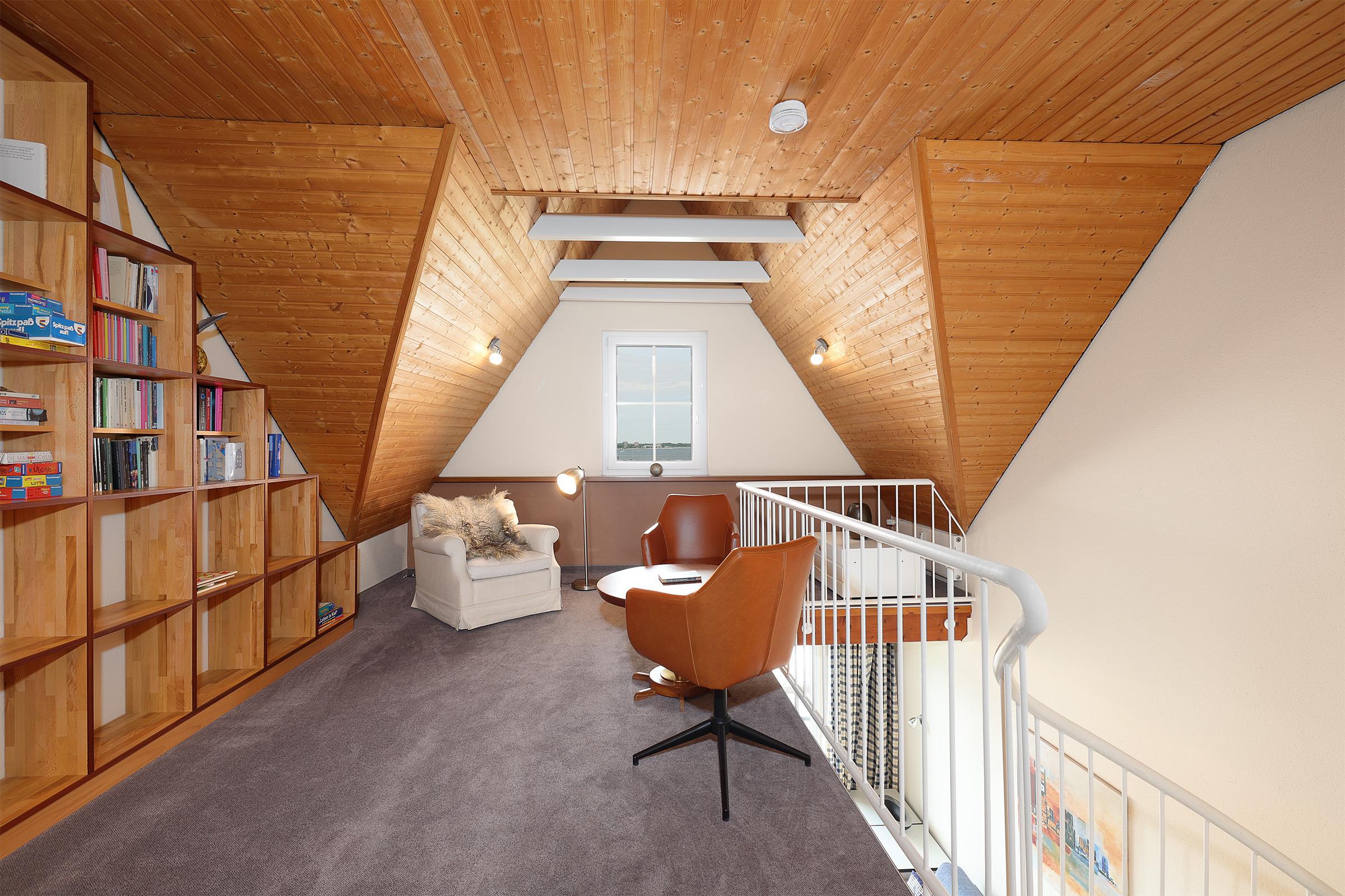 Der große Wohnbereich ist mit einer Küchenzeile ausgestattet und bietet mit dem bequemen Schlafsofa einen perfekten Aufenthalts- und Entspannungsort, wenn Sie einmal nicht an dem wundervollen Strand von Laboe oder dem interessanten Hinterland unterwegs sind. Über eine Wendeltreppe erreichen Sie eine große Empore, die mit einem gemütlichen Sessel ein schöner Rückzugsort ist, um z. B. in Ruhe ein Buch zu lesen. Von hier gehen auch die beiden Schlafzimmer ab, die durch die schrägen Wände eine ganz besonders heimelige Atmosphäre haben. Damit die Familienidylle nicht am Bad endet, gibt es zwei Bäder. Im unteren Bereich mit Dusche, oben mit Badewanne.
