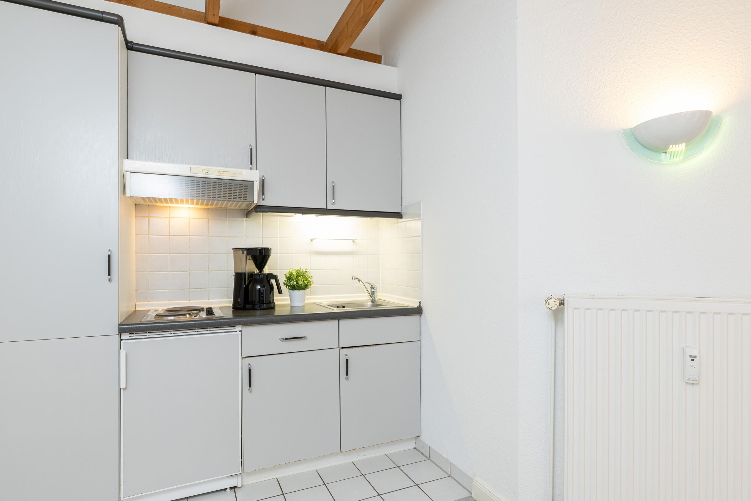 Die Wohnung befindet sich im 3. Obergeschoss und ist in ein geräumiges Wohn- Schlafzimmer mit Essplatz, Küchenzeile und separates Schlafzimmer mit Doppelbett unterteilt.