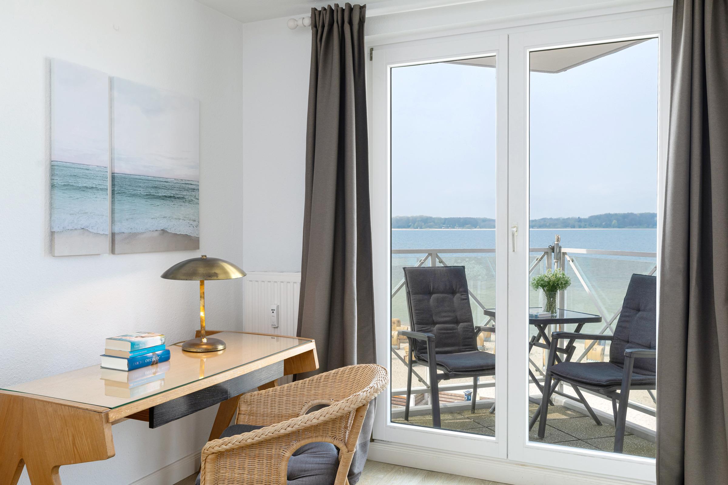 Moderne Ferienwohnung mit Balkon und Panoramablick auf die Kieler Förde in Laboe.