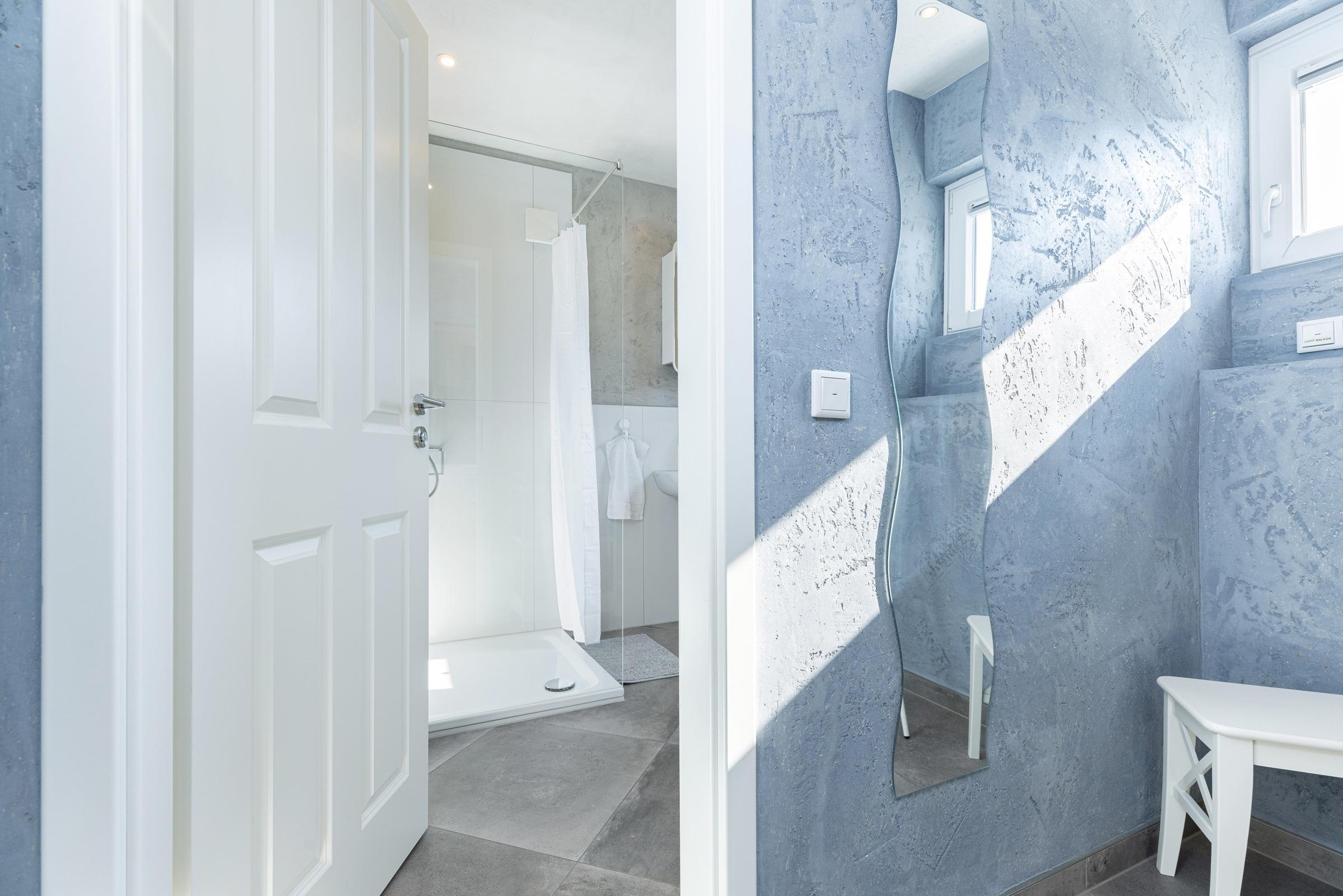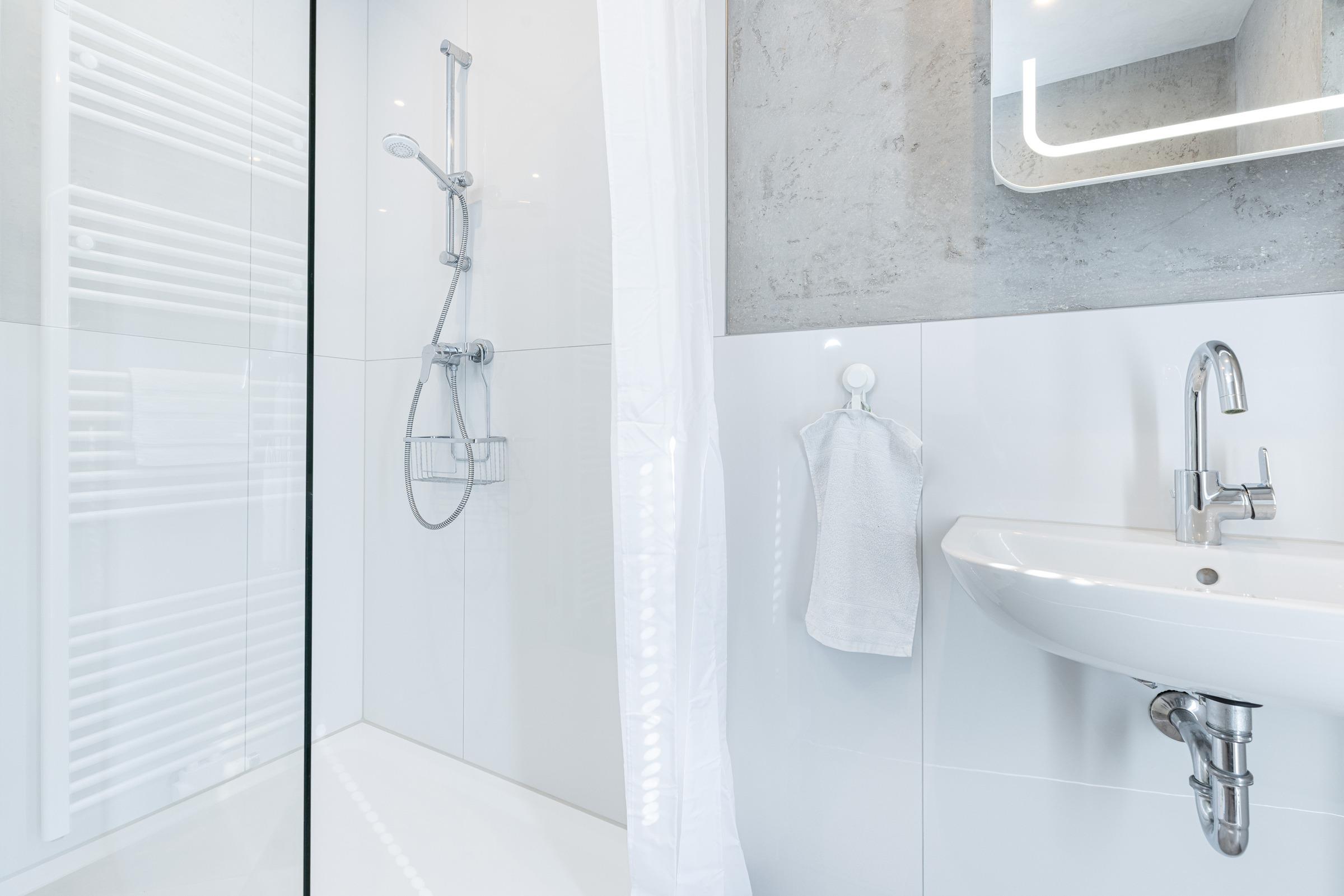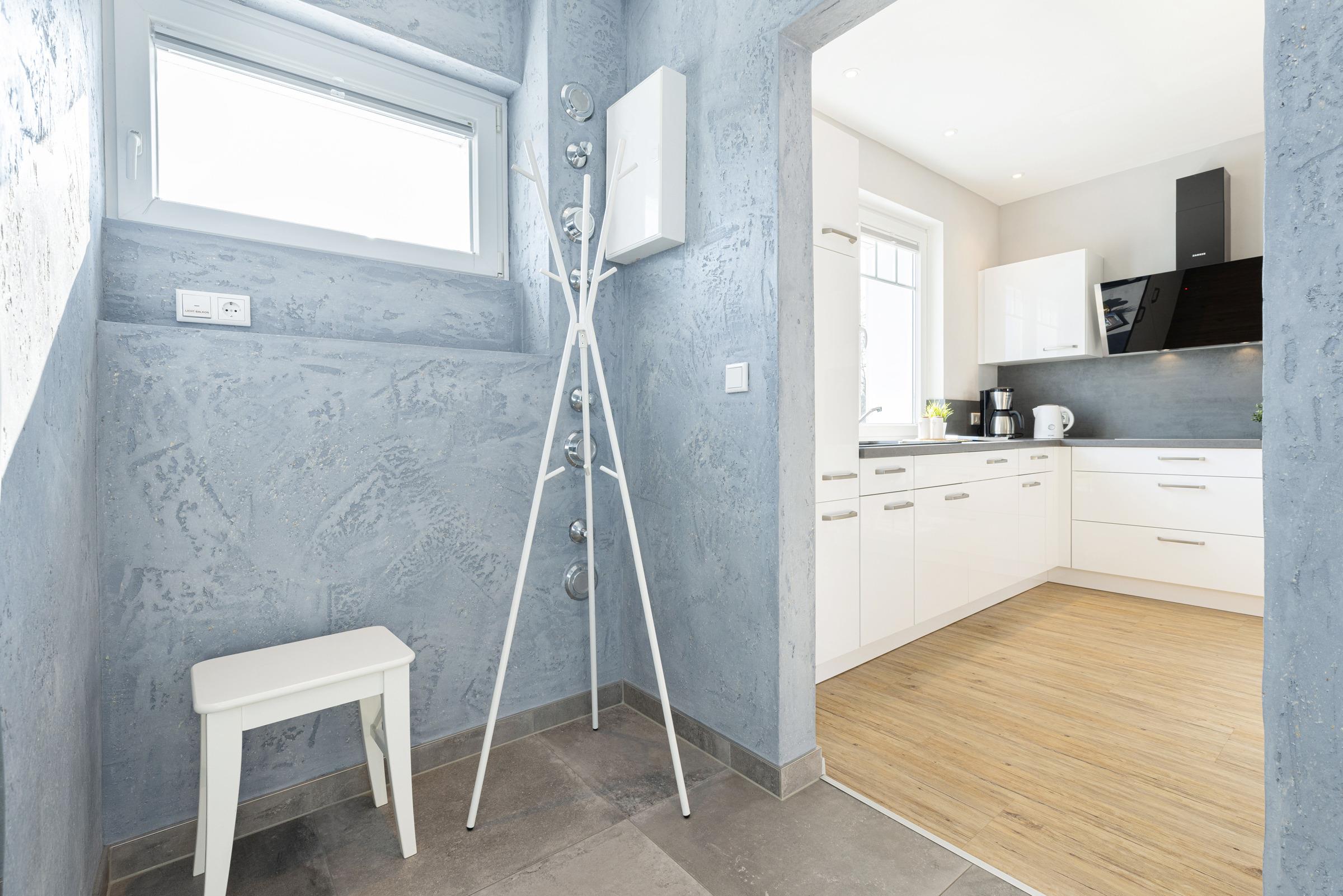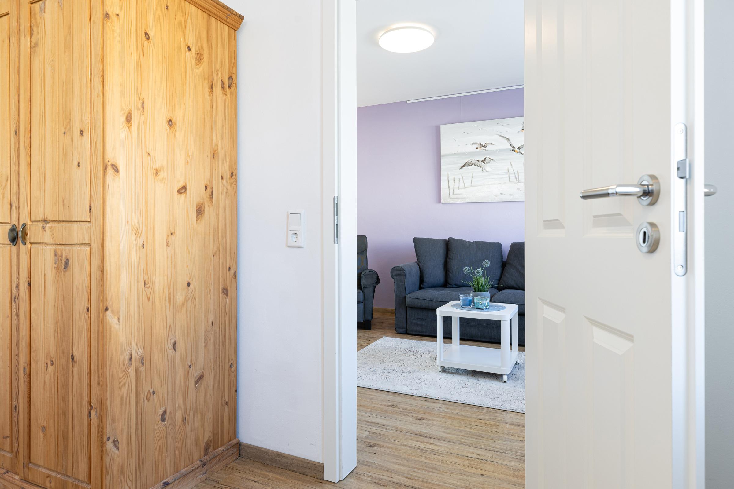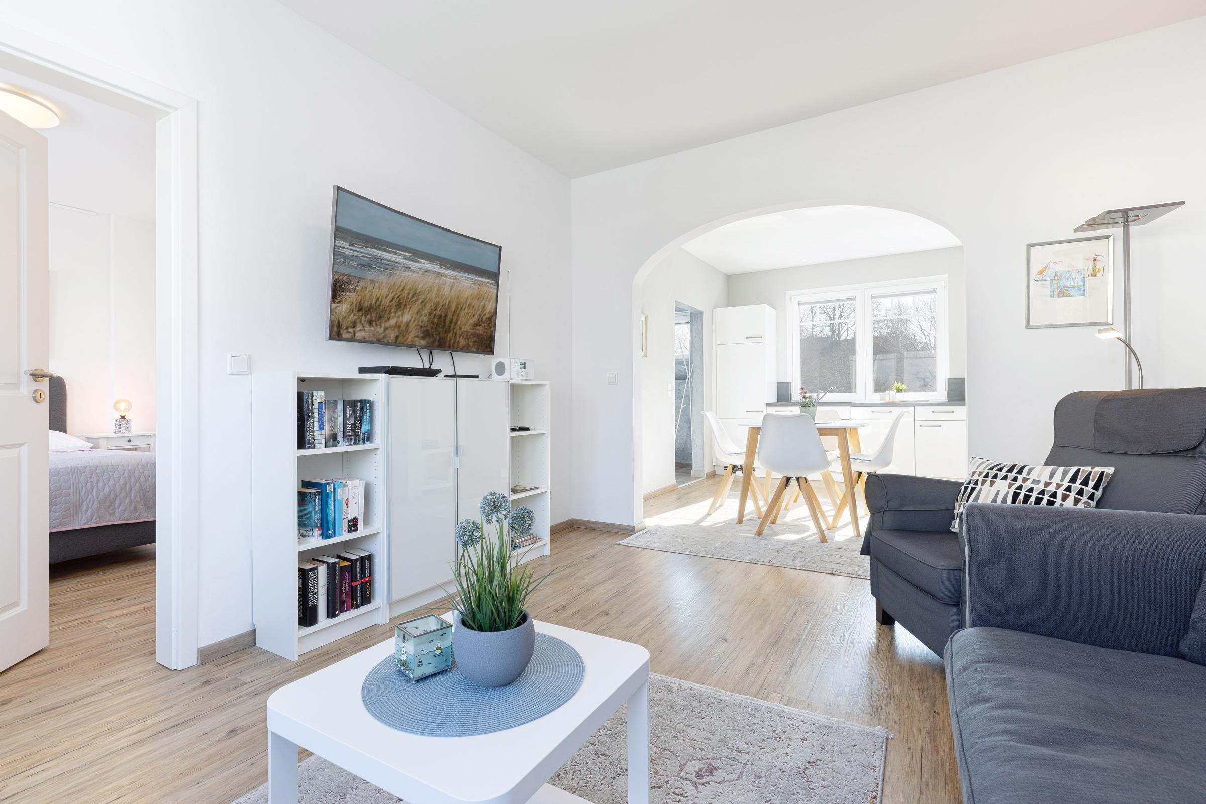 Die Eigentümer haben die Renovierung mit viel Liebe zum Detail geplant. Das Badezimmer verfügt über eine große bodengleiche Dusche und als Clou über eine Klönschnack-Tür, die zum Balkon mit Gartenblick führt. Der große Wohnküchen-Bereich umfasst die gesamte Tiefe des Hauses und bietet zur einen Seite ebenfalls einen Blick in den Garten und zur anderen Seite einen teilweisen Blick auf das Meer über die Strandstraße hinweg. Es erwartet die Gäste eine ganz neue Küche mit viel Zubehör, ein kleiner Esstisch, eine große Couch und ein Smart-TV mit vielen Programmen und Zugriffen auf diverse Mediatheken. Hochgeschwindigkeits-WLAN ist selbstverständlich ebenfalls für die Gäste verfügbar. Das kleine Schlafzimmer ist mit einem zusätzlichen TV-Gerät und einem neuen Bett samt neuer Matratzen und Kleiderschrank ausgestattet.