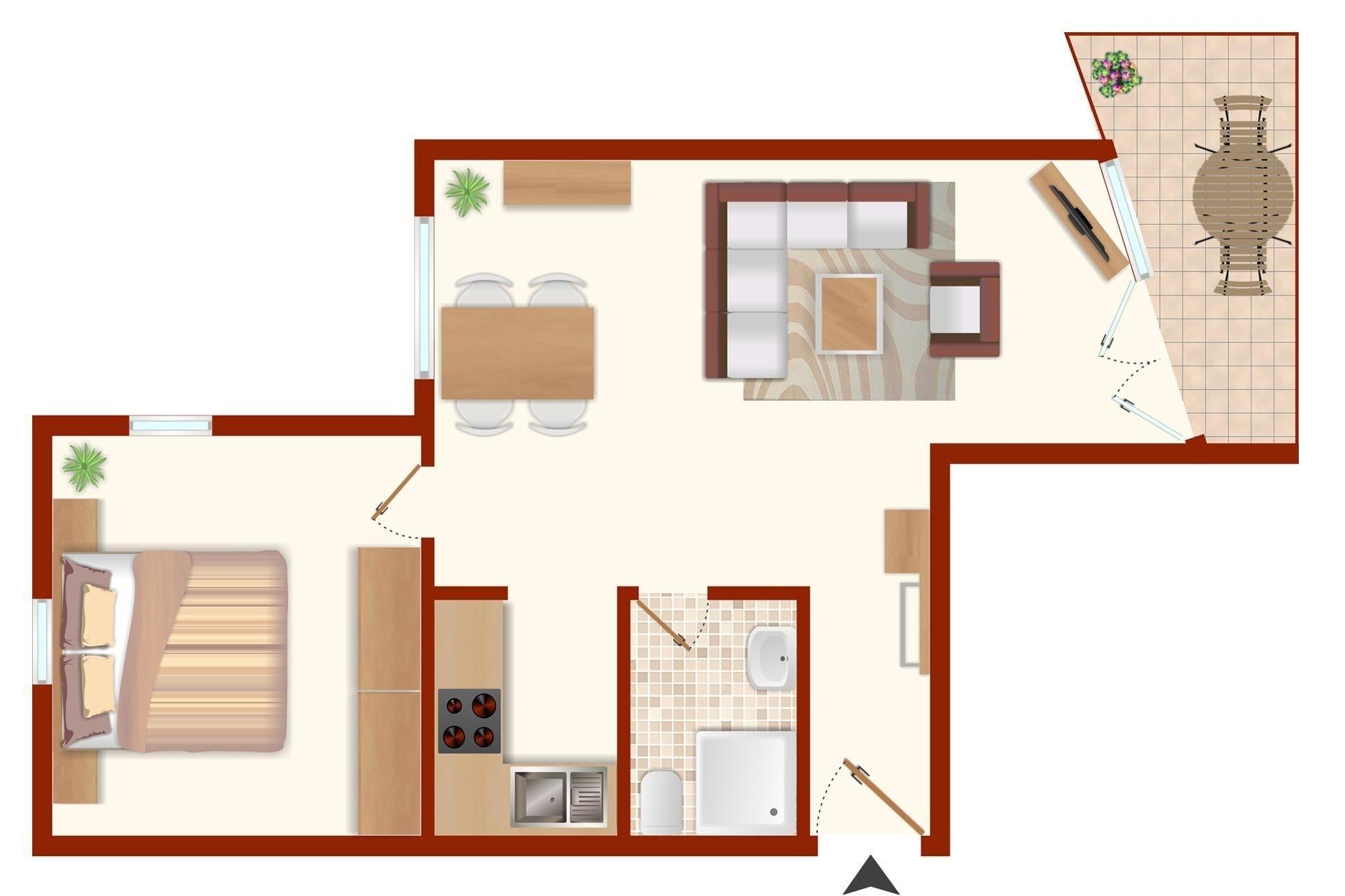 Die Wohnung besteht aus einem Wohnbereich mit einer Schlafcouch und Essecke, einem Schlafzimmer mit Doppelbett (180x200 cm), einer modernen Einbauküche mit Backofen und Ceranfeld sowie einem Badezimmer mit Dusche. Das Appartement wurde geschmackvoll und mit viel Liebe zum Detail eingerichtet. Das Appartement ist mit modernen elektronischen Geräten ausgestattet. Sogar eine I-Phone-Dockingstation ist dabei. Ein Blu-Ray-Player und ein zweiter Fernseher im Schlafzimmer runden das moderne Multimedia-Angebot ab. Ein Highlight ist der Sonnenbalkon mit einem unvergleichbaren Blick auf die Kieler Förde.