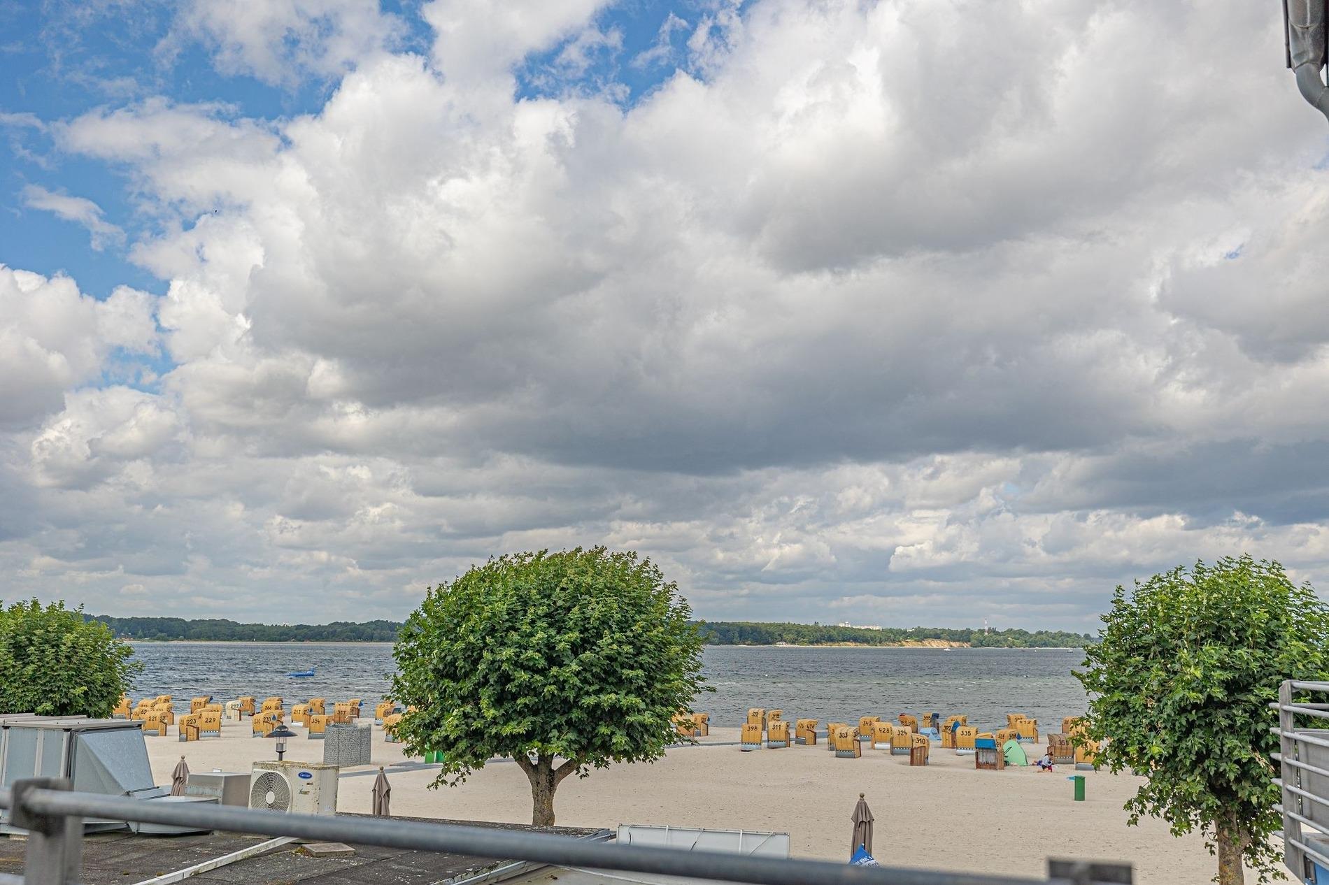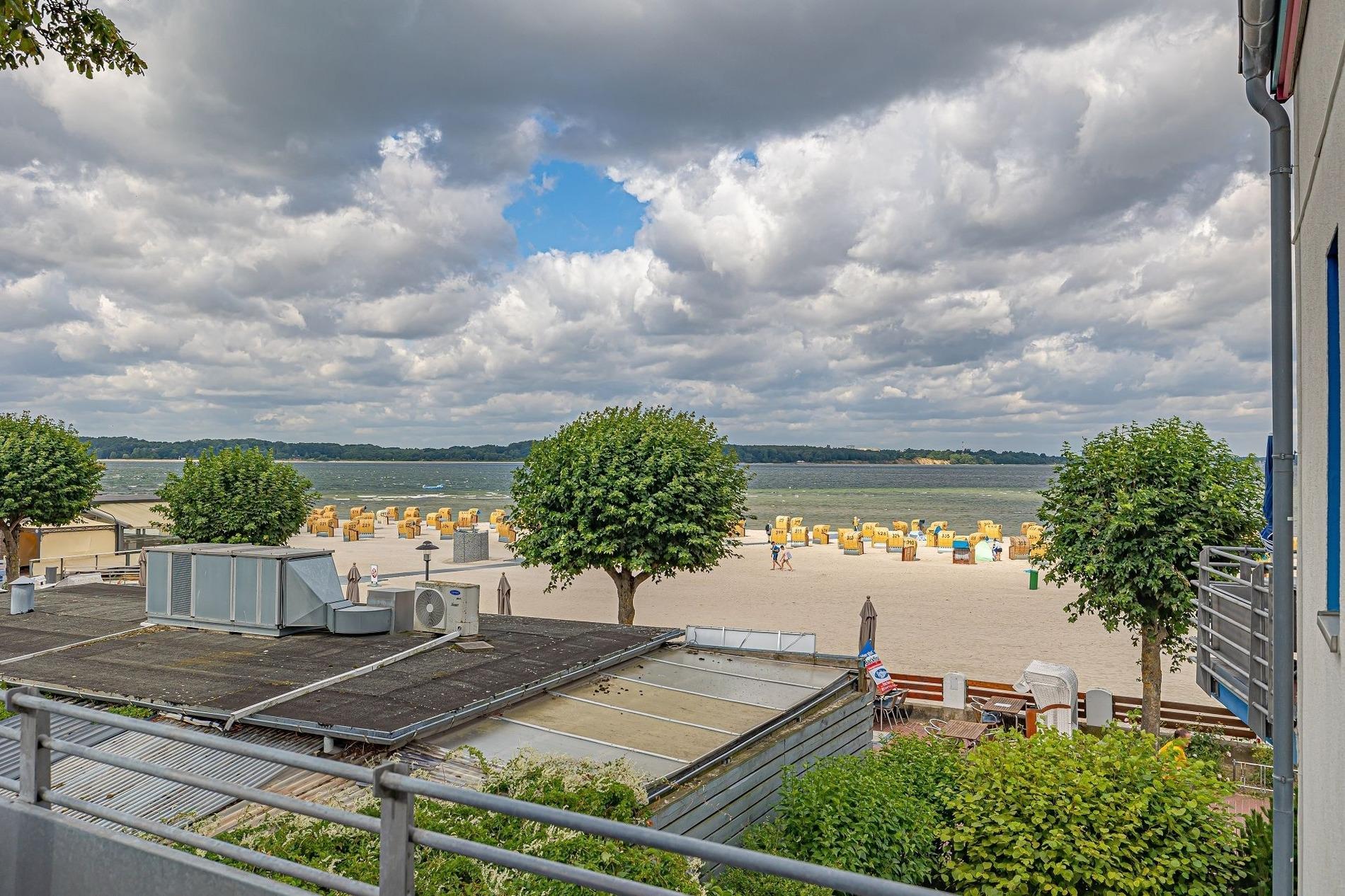 Moderne Ferienwohnung mit Balkon und Meerblick in Laboe, ideal für erholsamen Strandurlaub.