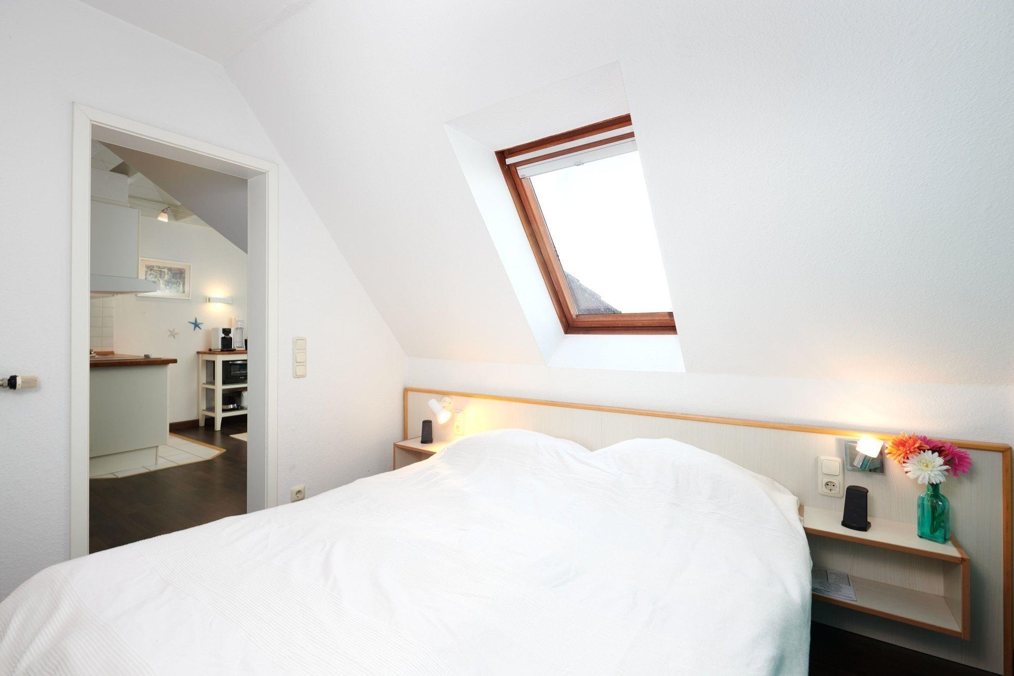 Die Wohnung verfügt über zwei getrennte Schlafzimmer. Bitte beachten Sie, dass der zweite Schlafraum über eine Sambatreppe (Raumspartreppe) zu erreichen ist. Die Wohnung selbst lässt sich bequem mit dem Aufzug erreichen. Es empfängt Sie ein gemütliches Wohnzimmer mit einer Küchenzeile. Ein absolutes Highlight ist die bequeme Récamiere direkt am Fenster, welche zu gemütlichen und ruhigen Momenten einlädt. Von diesem schönen Platz aus haben Sie einen romantischen Blick aufs Meer. Genießen Sie die Aussicht und lassen Sie Ihre Seele bei wunderschönen Sonnenuntergängen baumeln.