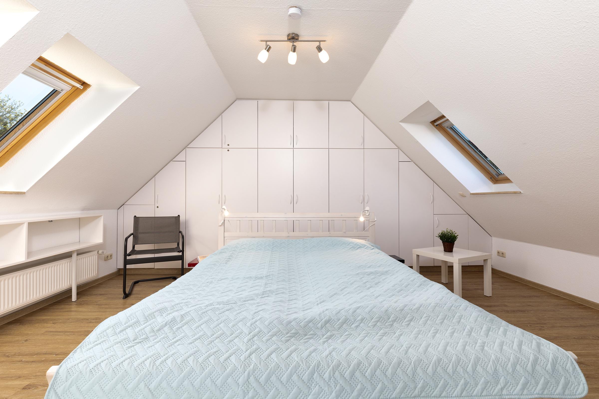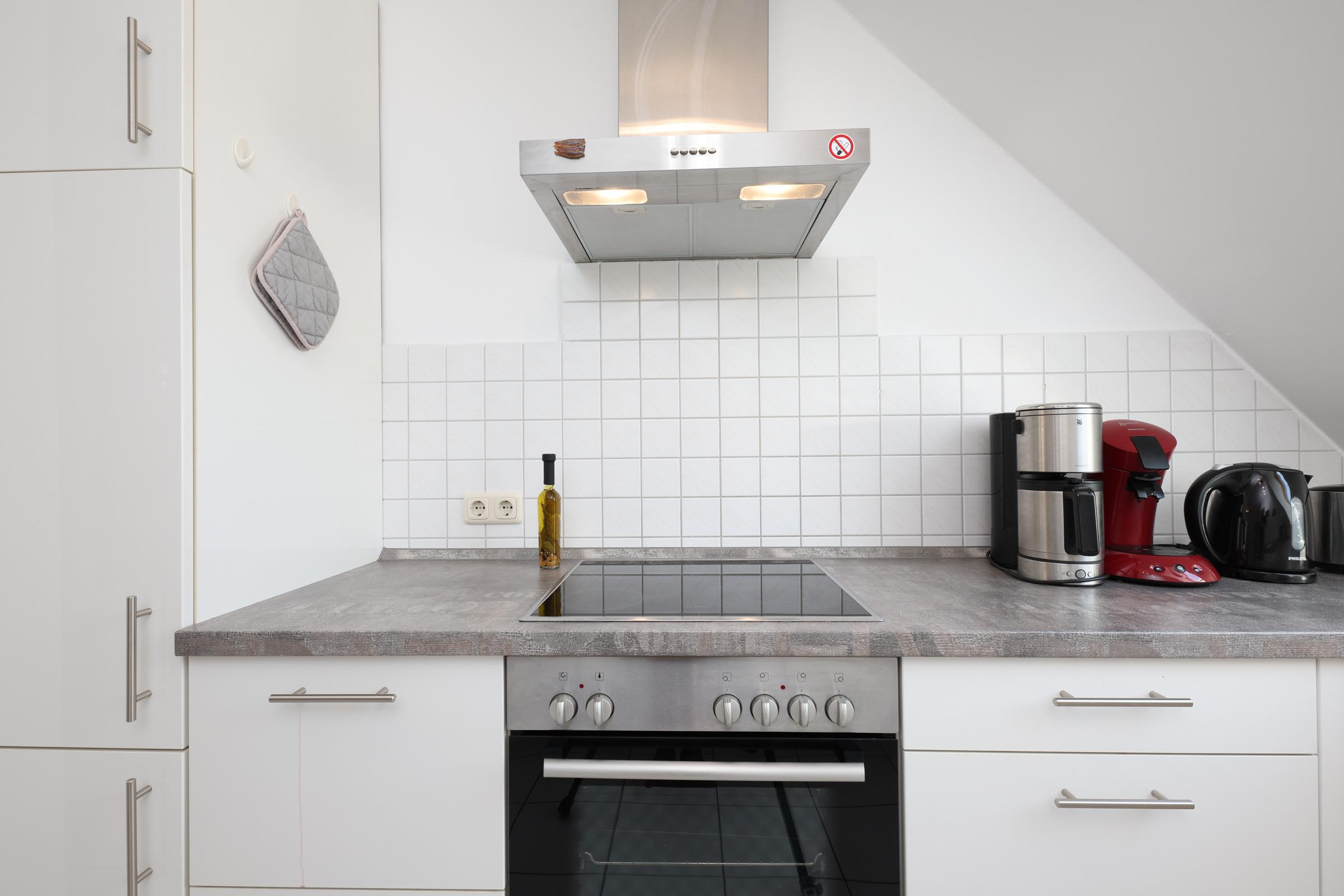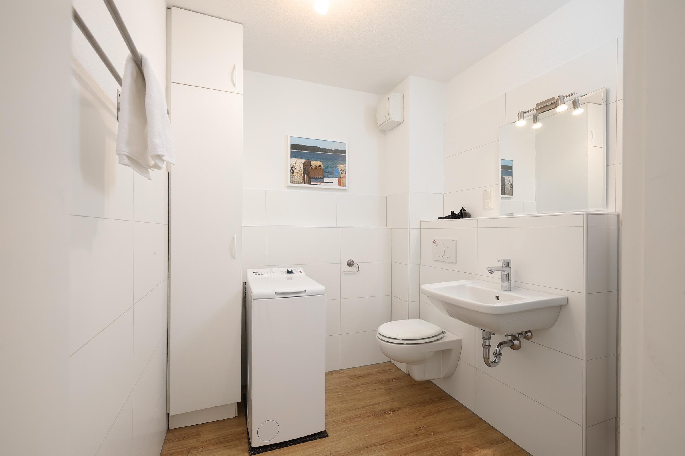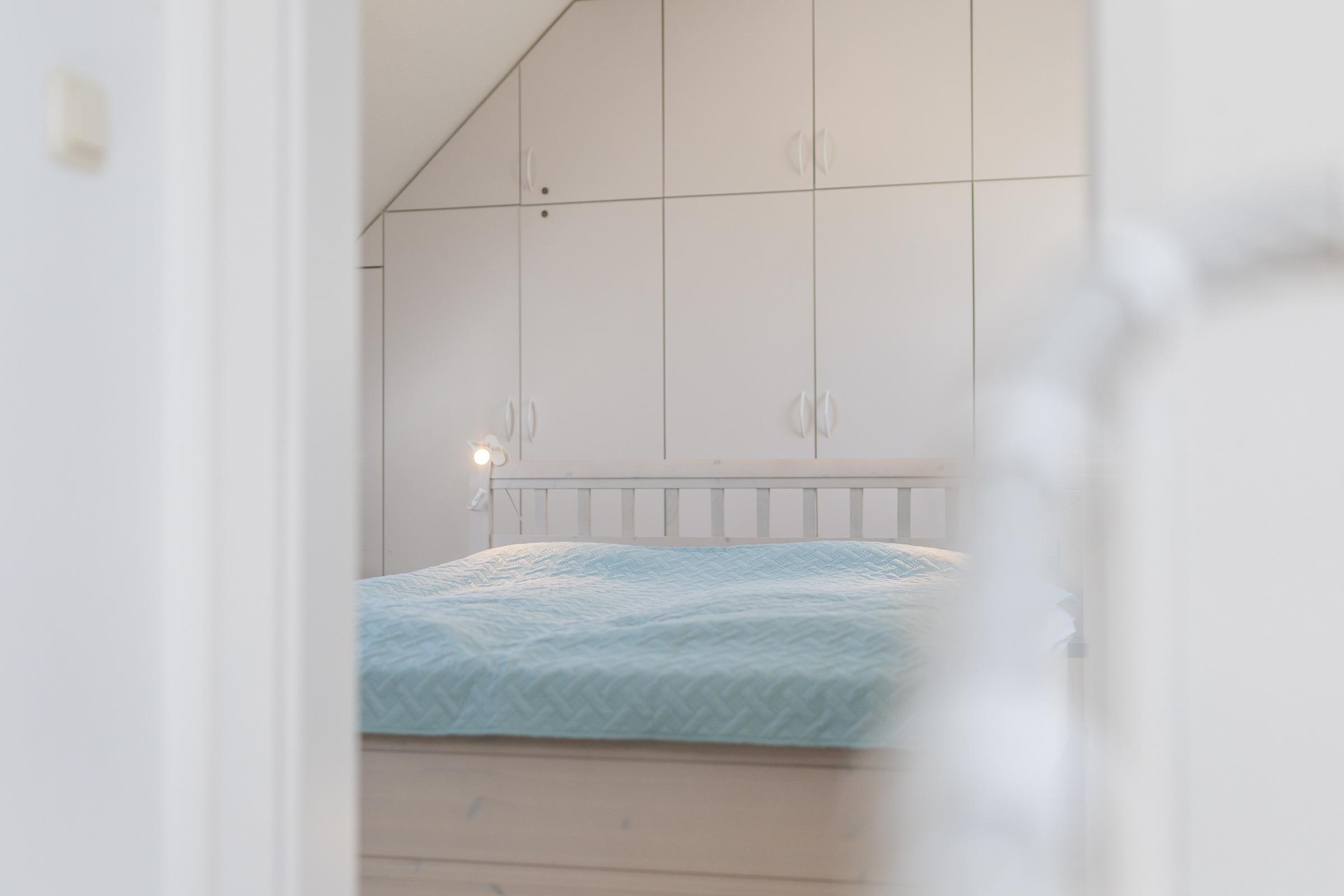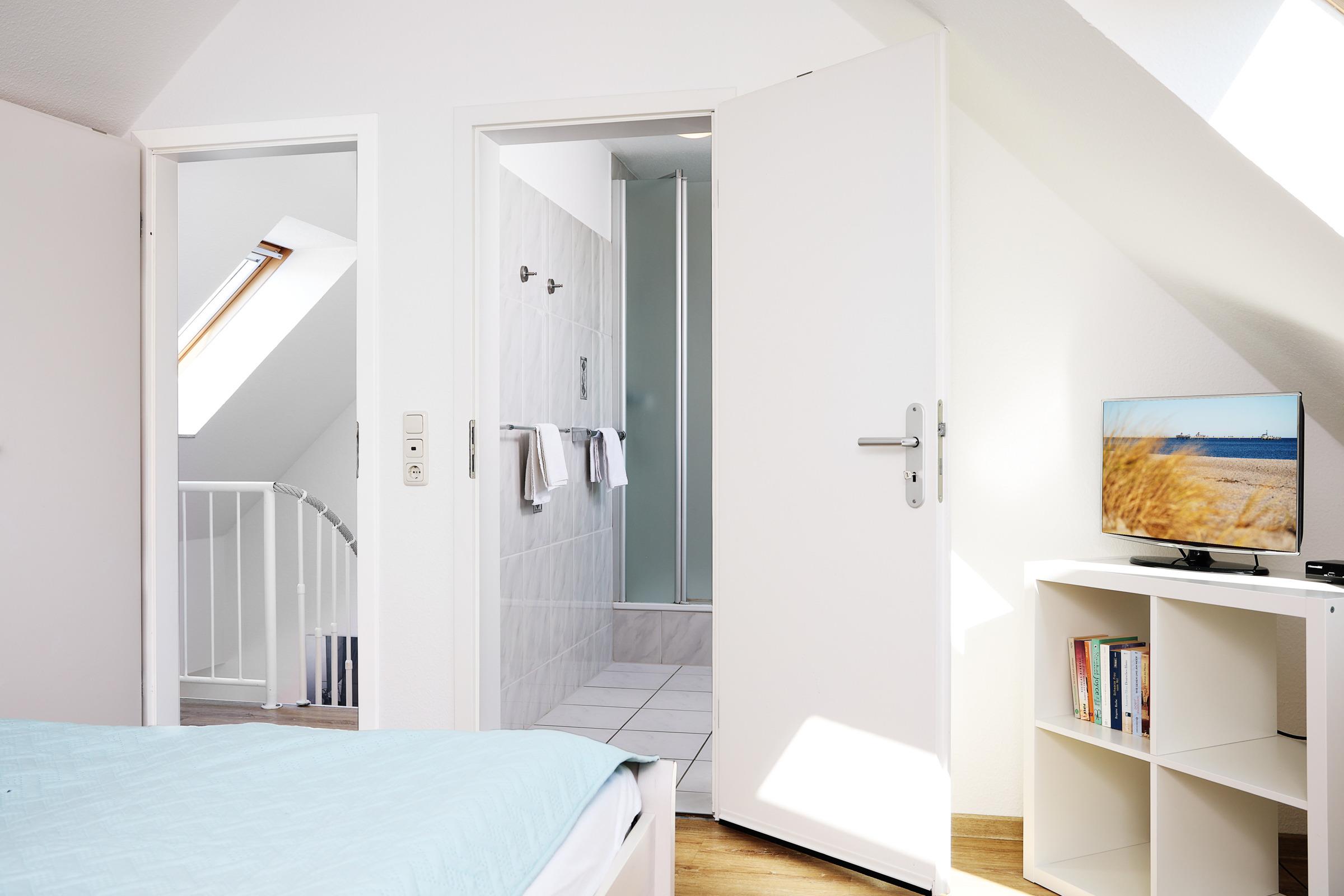 Die Wohnung verfügt insgesamt über 3-Zimmer. Das geräumige Wohn- Esszimmer hat eine Größe von fast 34 m² und ist von der Küche aus einzusehen. Die Küche ist mit allem ausgestattet, was das Herz eines oder mehrerer Köche erfreut. Auf der gleichen Etage befindet sich auch noch ein kleines, gemütliches Schlafzimmer. Auf beiden Ebenen finden Sie jeweils ein Bad, ausgestattet mit Dusche und Haartrockner. Zur oberen Ebene gelangen Sie über eine Buchenholztreppe aus dem Wohnzimmer. Durch seine Schrägen und die Fenster im Giebel ist es ein besonders heimeliger und lichtdurchfluteter Raum. Viele Fenster fangen das Licht ein und gewähren Ihnen einen schönen Weitblick ins Grüne. Sogar die Ostsee ist, im Winter mehr und im Sommer weniger, zu sehen. Der Balkon ist nach Süd-West ausgerichtet, sodass Sie den ganzen Tag die Sonne und den schönen Blick genießen können. Der kleine Ostseeblick zwischen den Häusern der Strandstraße bietet eine willkommene Abwechselung!