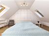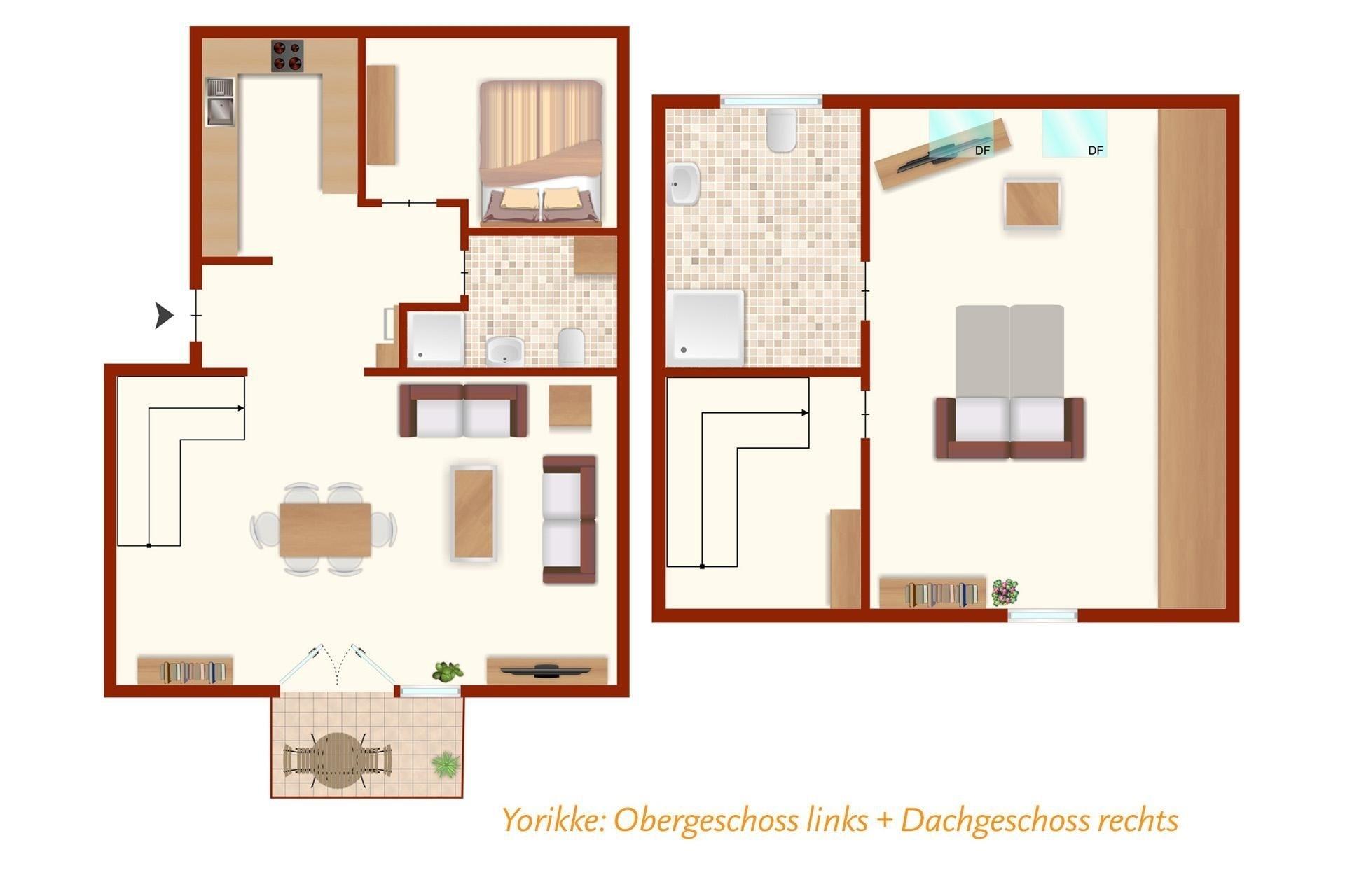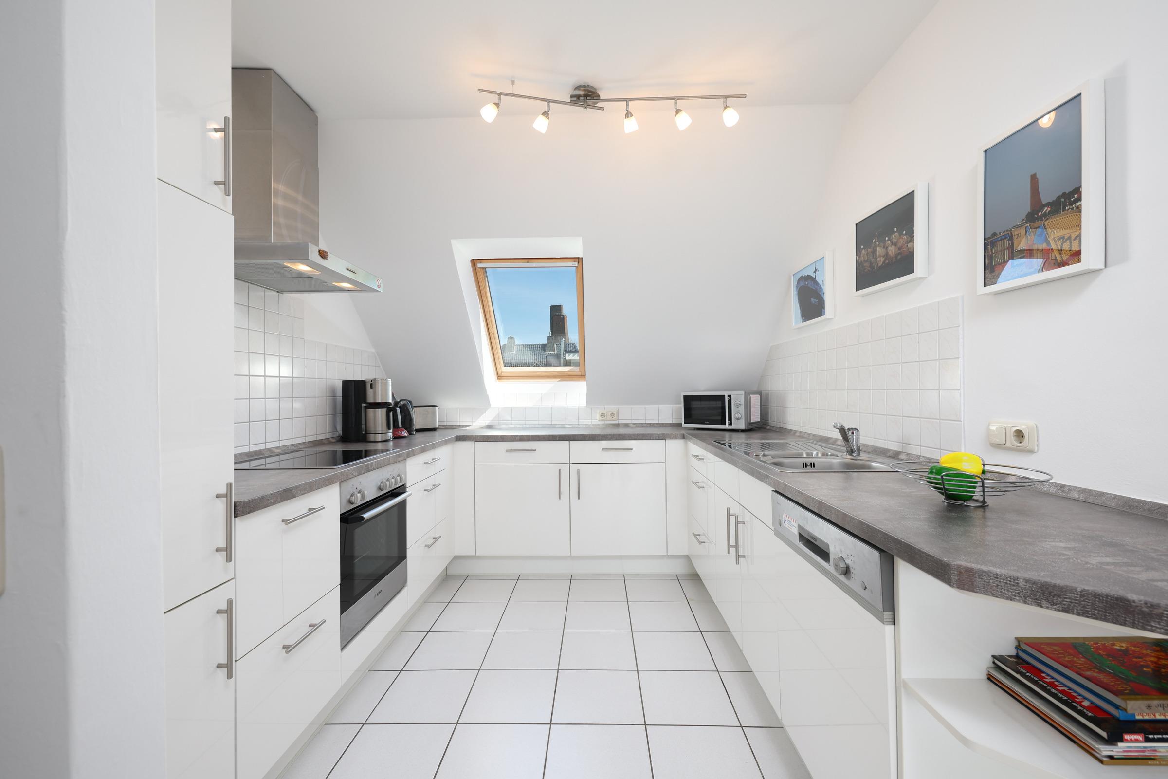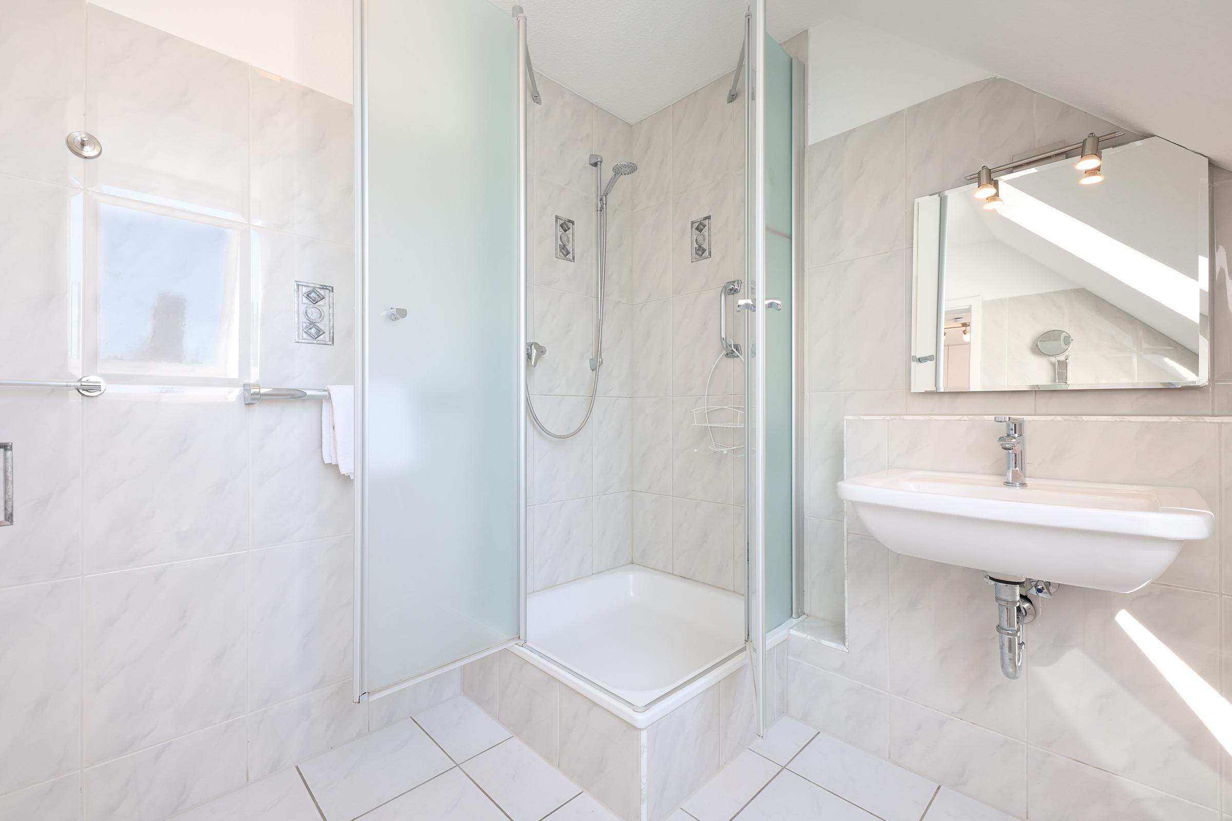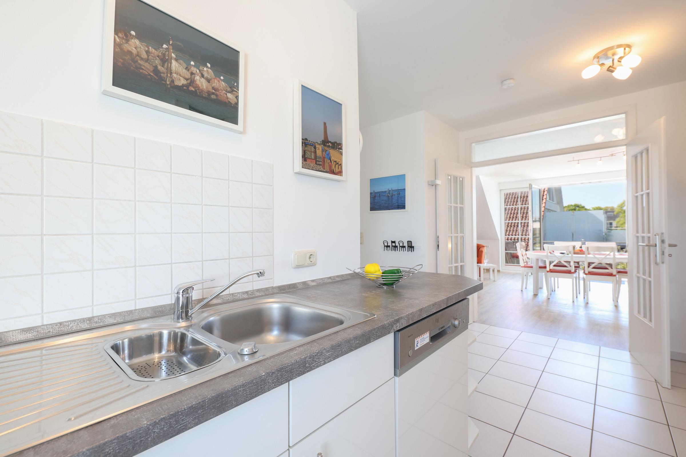 Die Wohnung verfügt insgesamt über 3-Zimmer. Das geräumige Wohn- Esszimmer hat eine Größe von fast 34 m² und ist von der Küche aus einzusehen. Die Küche ist mit allem ausgestattet, was das Herz eines oder mehrerer Köche erfreut. Auf der gleichen Etage befindet sich auch noch ein kleines, gemütliches Schlafzimmer. Auf beiden Ebenen finden Sie jeweils ein Bad, ausgestattet mit Dusche und Haartrockner. Zur oberen Ebene gelangen Sie über eine Buchenholztreppe aus dem Wohnzimmer. Durch seine Schrägen und die Fenster im Giebel ist es ein besonders heimeliger und lichtdurchfluteter Raum. Viele Fenster fangen das Licht ein und gewähren Ihnen einen schönen Weitblick ins Grüne. Sogar die Ostsee ist, im Winter mehr und im Sommer weniger, zu sehen. Der Balkon ist nach Süd-West ausgerichtet, sodass Sie den ganzen Tag die Sonne und den schönen Blick genießen können. Der kleine Ostseeblick zwischen den Häusern der Strandstraße bietet eine willkommene Abwechselung!