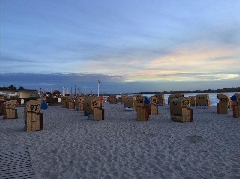Moderne Ferienwohnung am Yachthafen Laboe mit malerischem Blick und Strandkorb für entspannte Tage am Wasser.