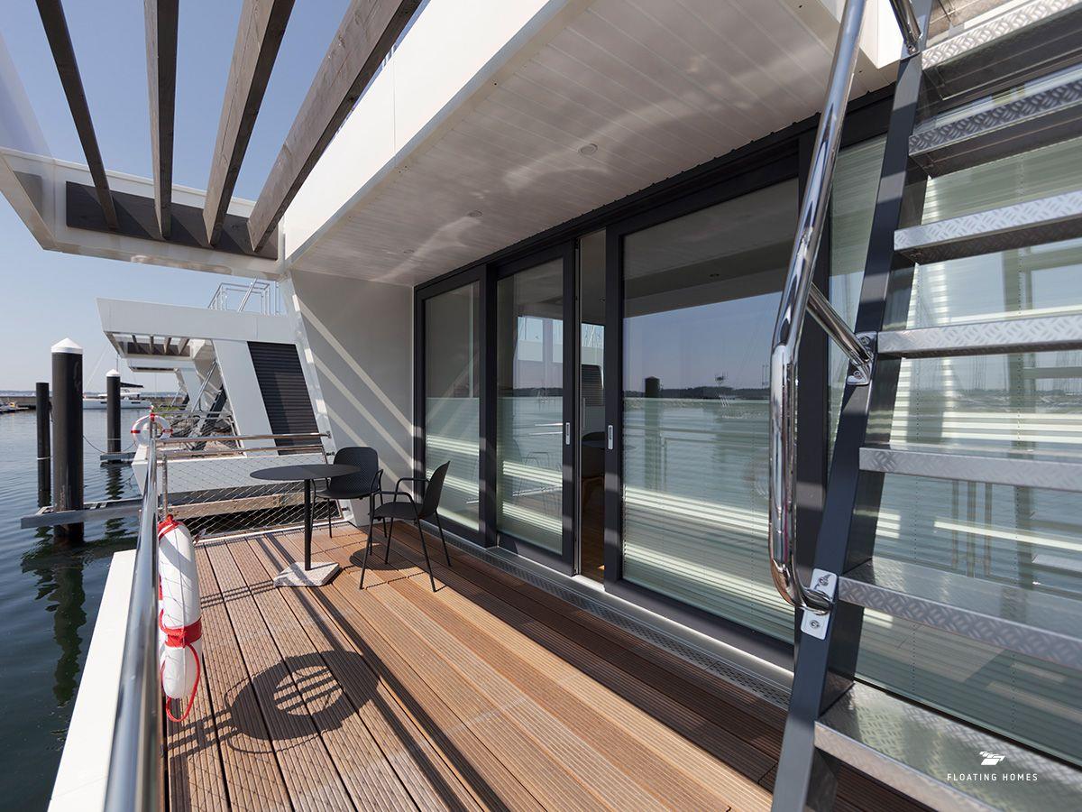 Erleben Sie maritimen Luxus auf dem stilvollen Hausboot Kielwasser im Hafen von Laboe mit Sauna und Panoramadeck.