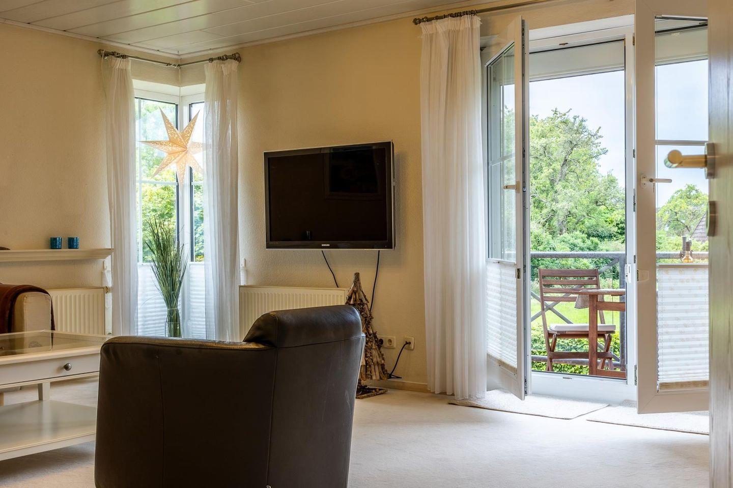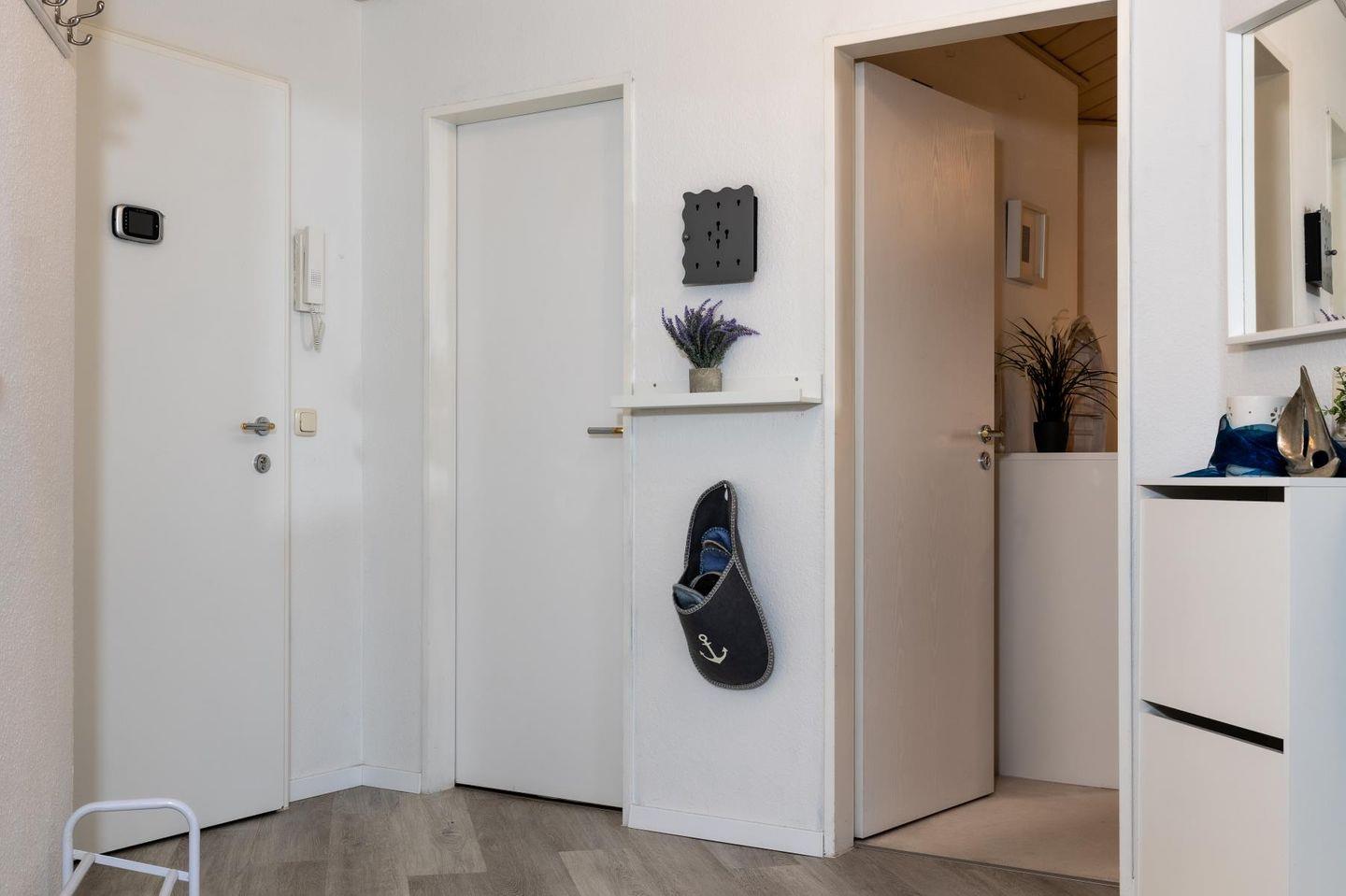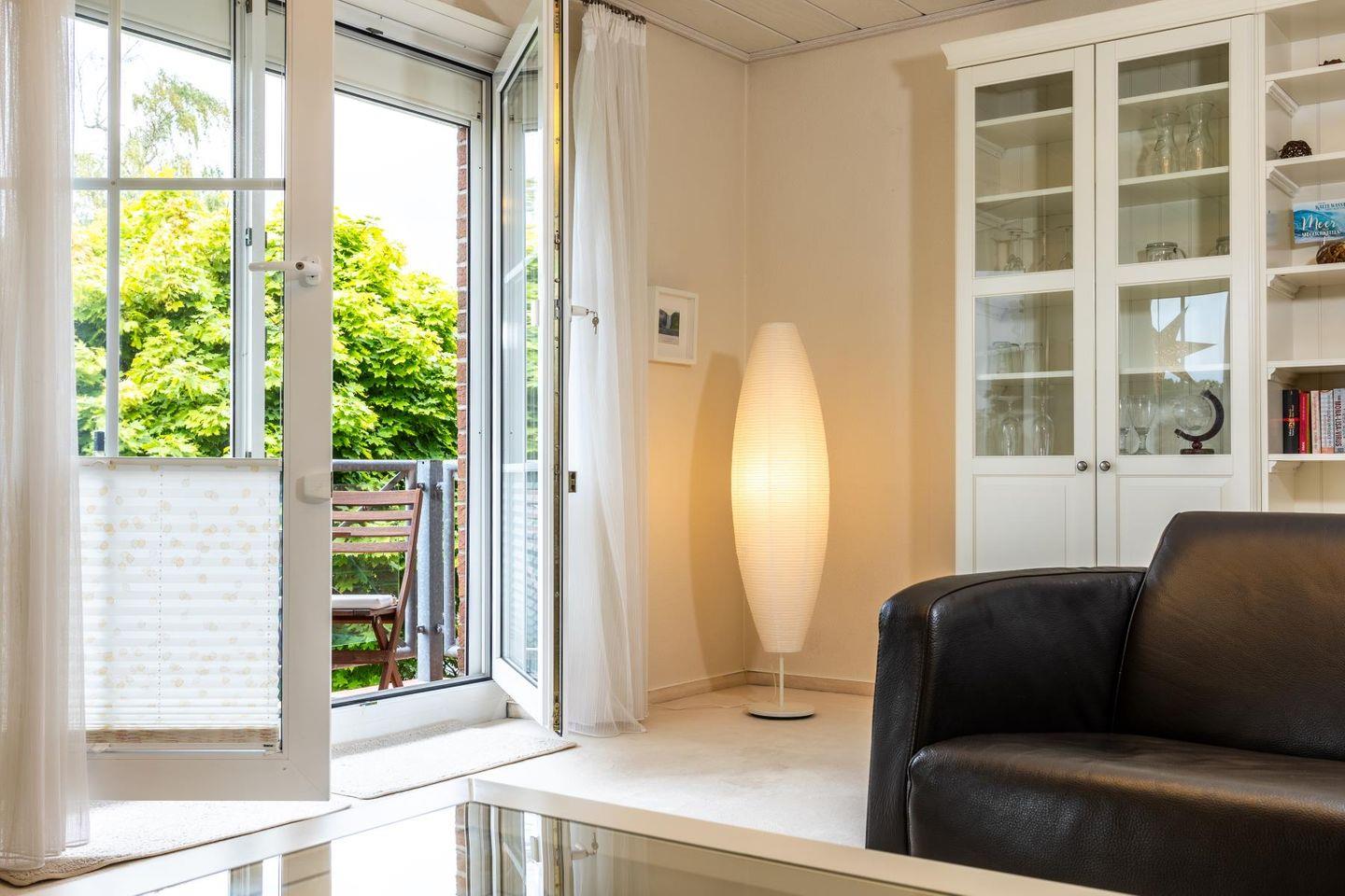Die Wohnung empfängt dich mit einem hellen Wohnzimmer, in dem eine große Sofaecke zum Ausruhen einlädt – ob mit einem guten Buch, einem Film oder einfach bei einem ruhigen Moment mit Blick nach draußen. Die separate Küche ist voll ausgestattet, damit du dich ganz einfach selbst versorgen kannst: Cerankochfeld, Backofen, Kühlschrank, Spülmaschine, Mikrowelle, Kaffeemaschine und alles, was sonst noch dazugehört. Am Esstisch ist Platz für ausgedehnte Mahlzeiten oder ein schnelles Frühstück, bevor es raus ans Wasser geht.