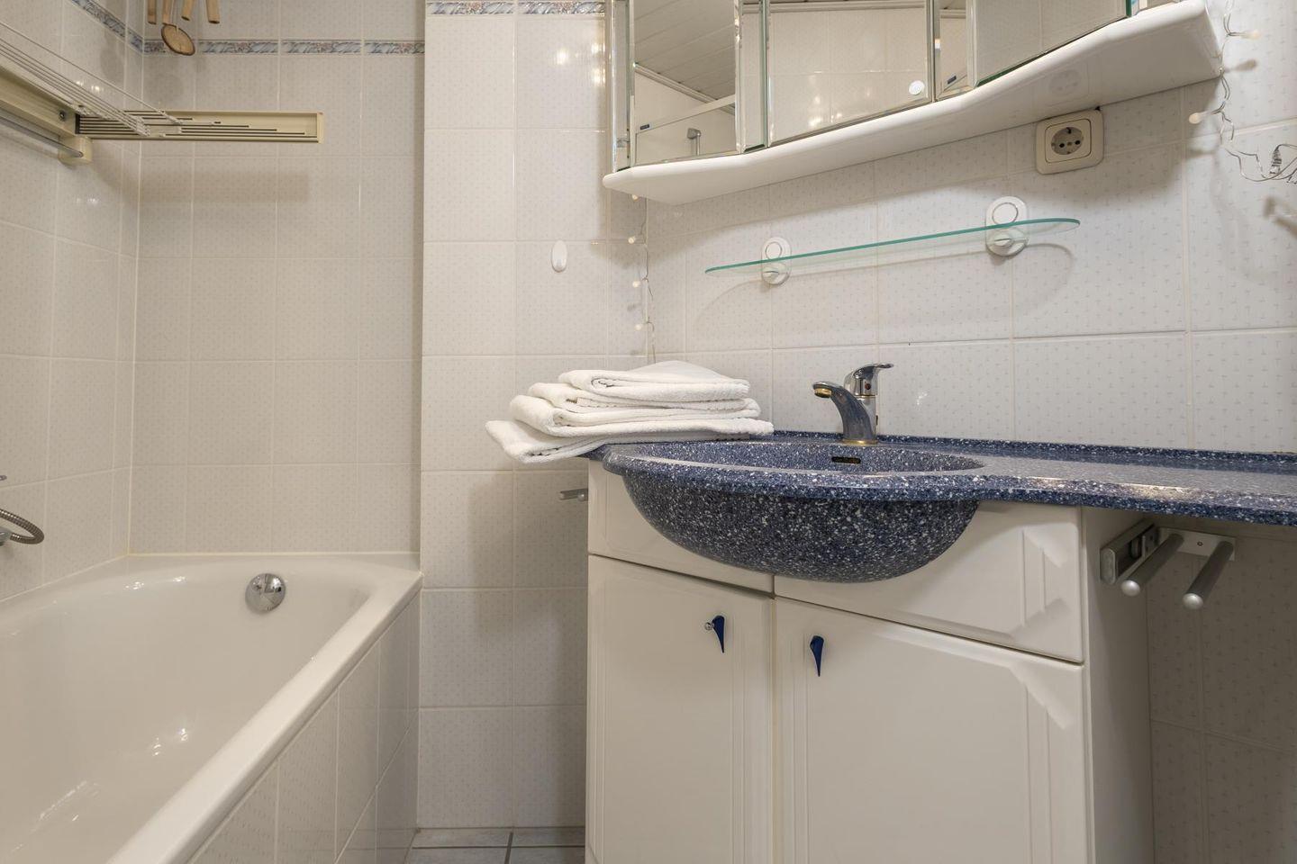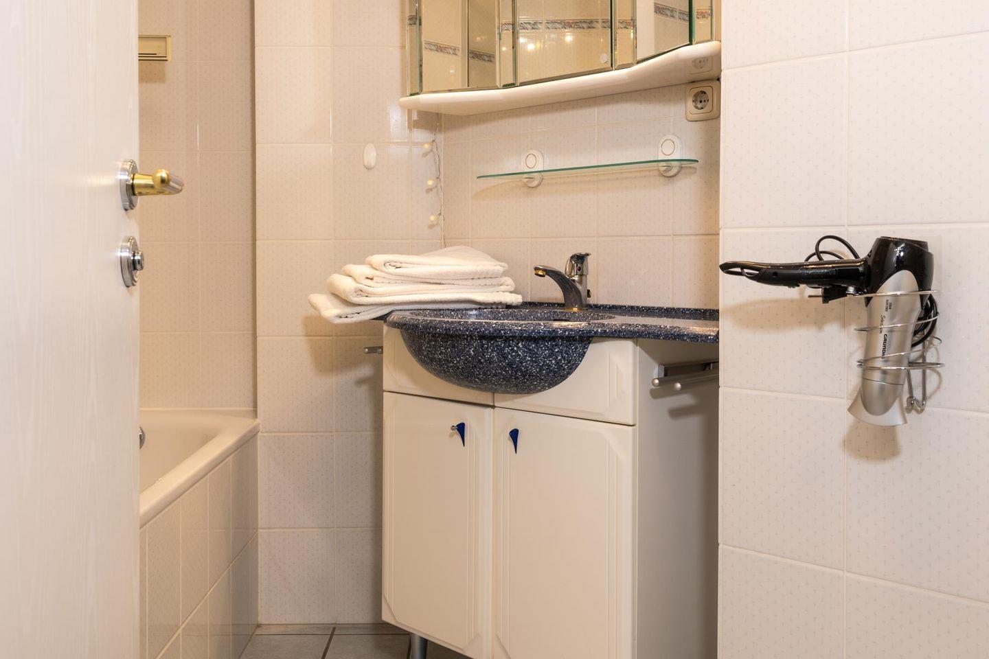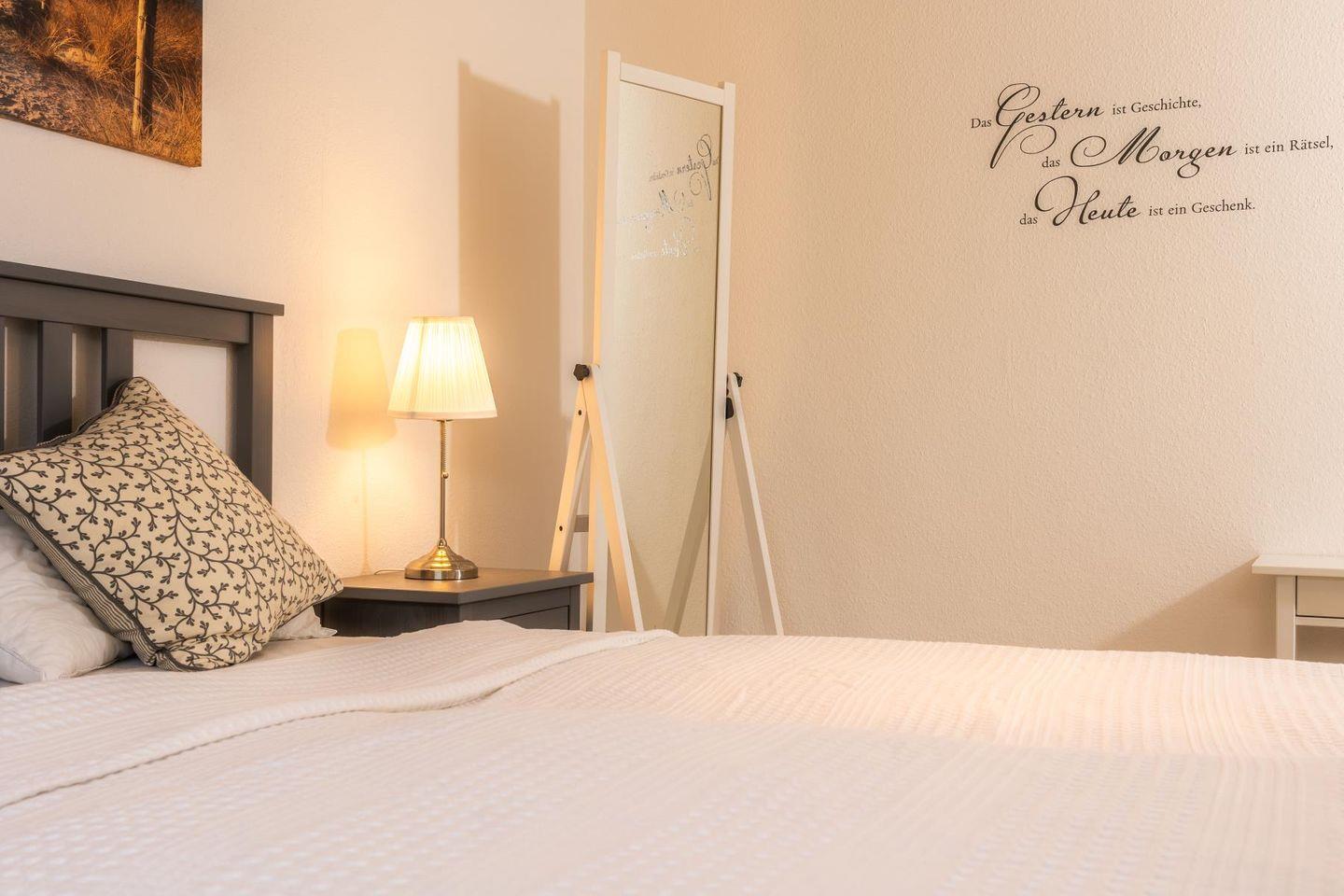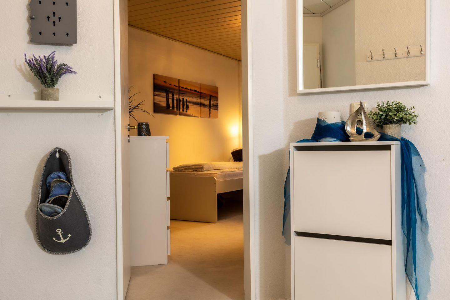 Die beiden Schlafzimmer sind klar und gemütlich eingerichtet. Im einen schläfst du im bequemen Doppelbett, im anderen in zwei Einzelbetten – so hat jeder seinen eigenen Rückzugsort. Das Badezimmer bietet sowohl Dusche als auch Badewanne und ist damit ideal, um sich nach einem Tag am Strand zu erfrischen oder einfach mal abzutauchen. Eine Waschmaschine steht ebenfalls zur Verfügung, falls der Aufenthalt etwas länger dauert.