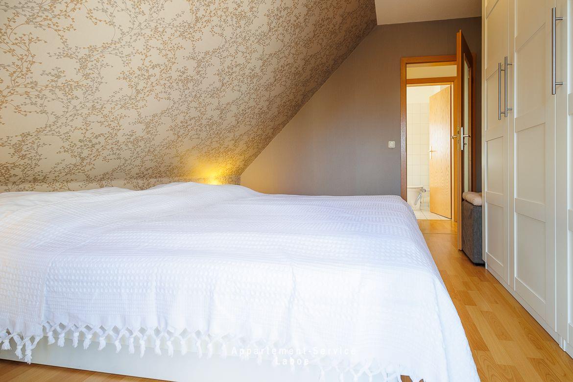 Über eine Treppe gelangst du in die obere Etage. Dort befindet sich das geräumige Schlafzimmer mit Doppelbett und Zugang zum zweiten Balkon. Direkt daneben liegt ein weiteres Badezimmer.