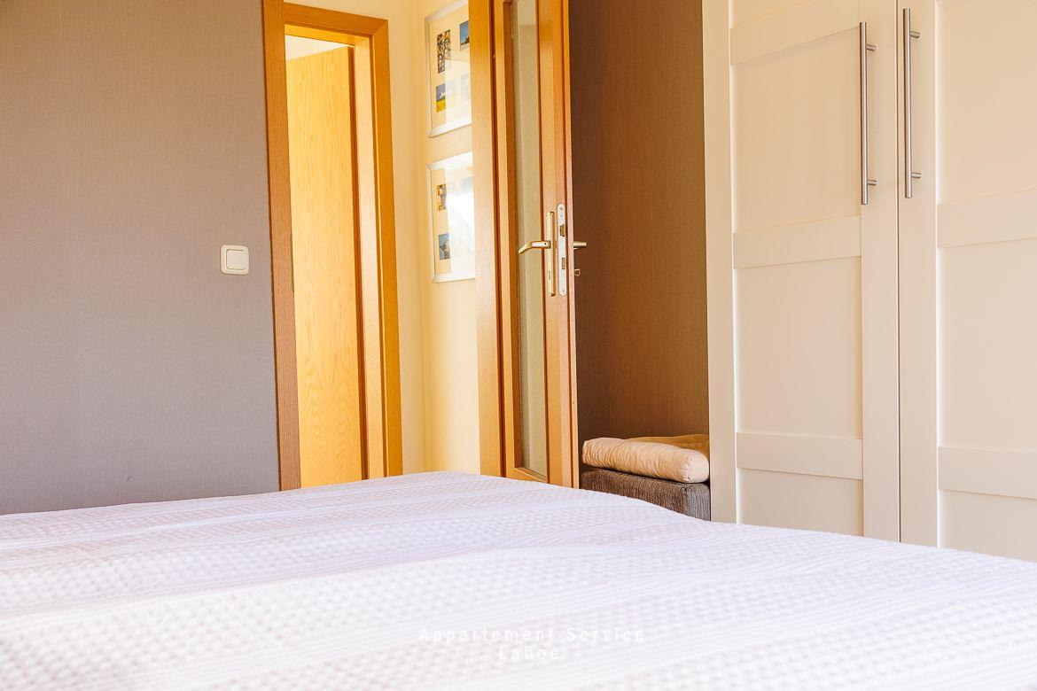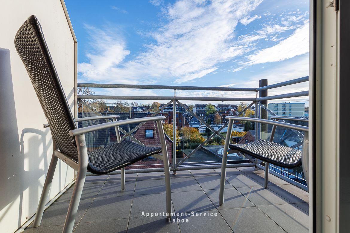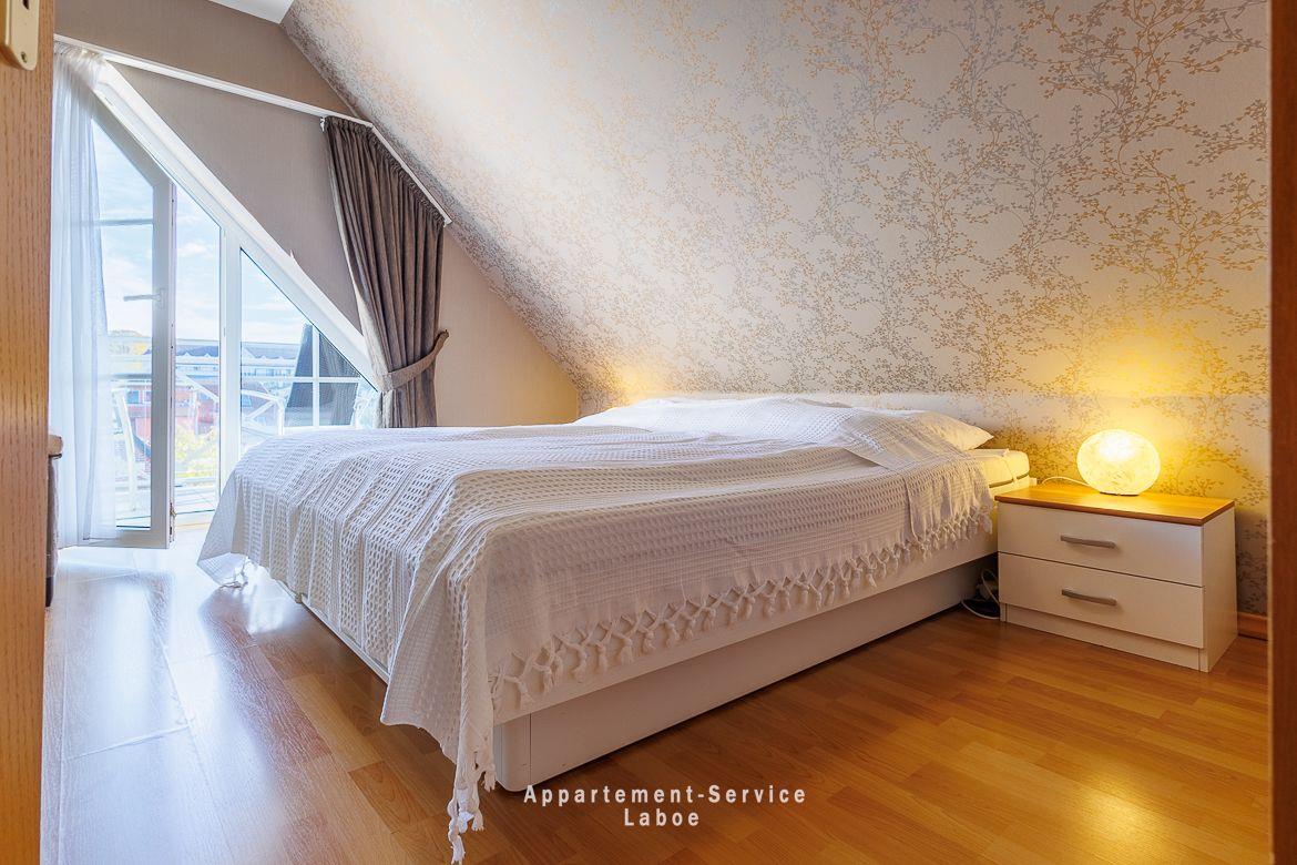 Beide Balkone zeigen zur ruhigen Seitenstraße und bieten dir geschützte Plätze an der frischen Luft. Ob zum Frühstück in der Sonne oder für ein stilles Glas Wein am Abend. Hier findest du dein eigenes kleines Stück Laboe. Einen direkten Meerblick gibt es zwar nicht, dafür bist du in weniger als einer Minute mit den Füßen im Sand.
