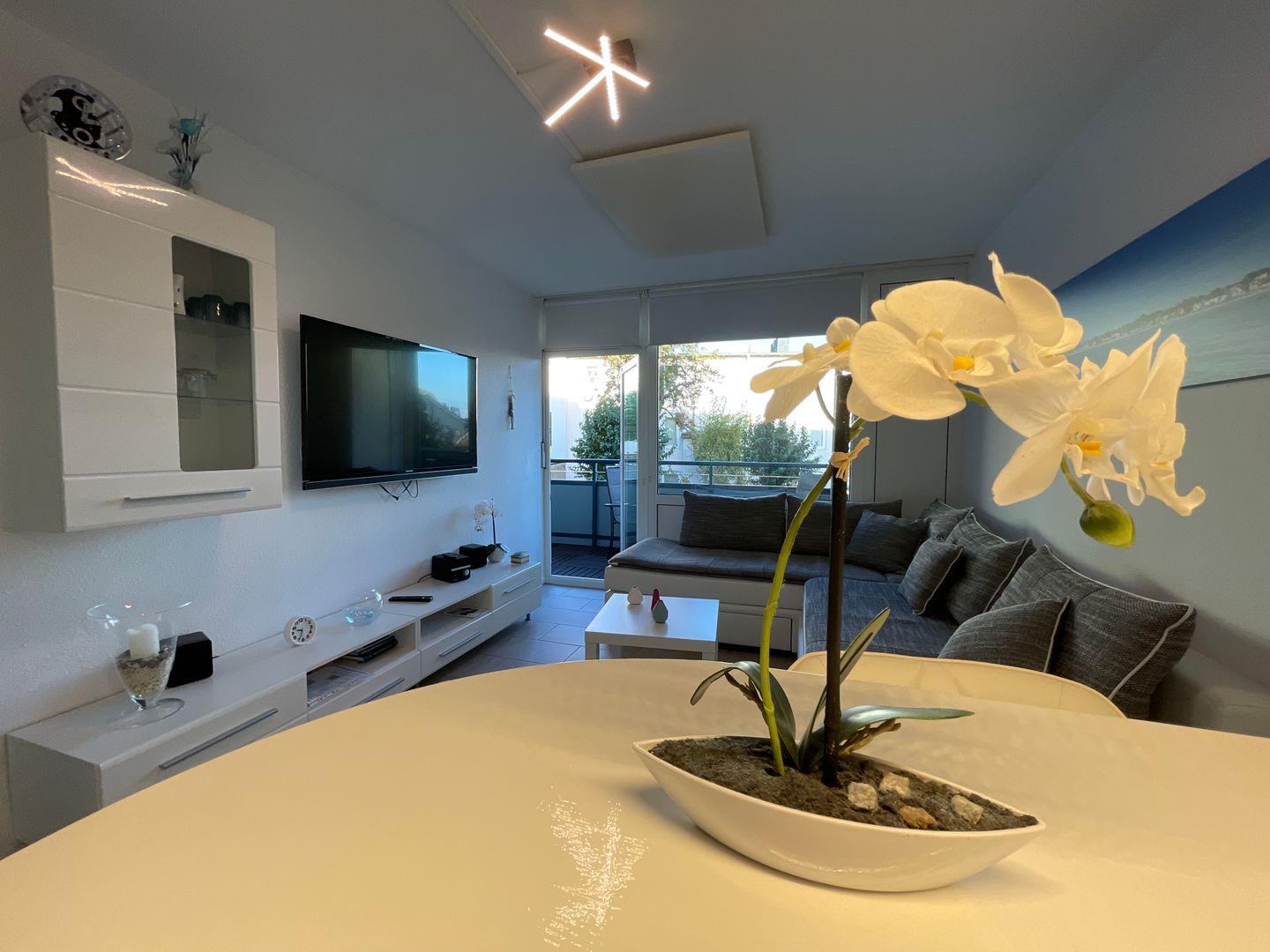 Die Wohnung liegt zentral, aber angenehm zurückgezogen und empfängt dich auf rund 40 Quadratmetern mit einer durchdachten Raumaufteilung für bis zu vier Personen. Im Wohnbereich erwartet dich ein hochwertiges Schlafsofa, das sich mit wenigen Handgriffen in ein komfortables Bett verwandelt. Perfekt für ruhige Nächte nach einem Tag am Wasser. Ein großer Flatscreen-TV sorgt für Unterhaltung.