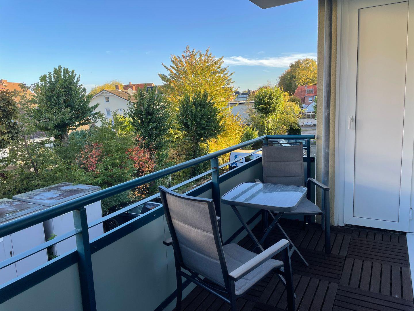Besonders schön: die Loggia. Hier kannst du draußen frühstücken, bei einem Buch entspannen oder den Tag in aller Ruhe ausklingen lassen. Die Nachmittagssonne zeigt sich hier für eine Weile und schenkt dir einen geschützten Platz an der frischen Luft.