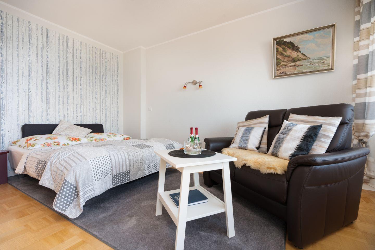 Ferienwohnung "Förde-Traumblick 3" im 2. Stock direkt in erster Reihe am Strand von Laboe: 1 Zimmer Wohnung bis zu 2 Personen,kombiniertes Wohnschlafzimmer mit gemütlicher Sitzgruppe und Doppelbett, Essplatz in der Loggia mit perfektem Meerblick, volleingerichtete Küche mit Geschirrspüler, TV, Wlan, Dusche/WC, PKW-Stellplatz direkt am Haus