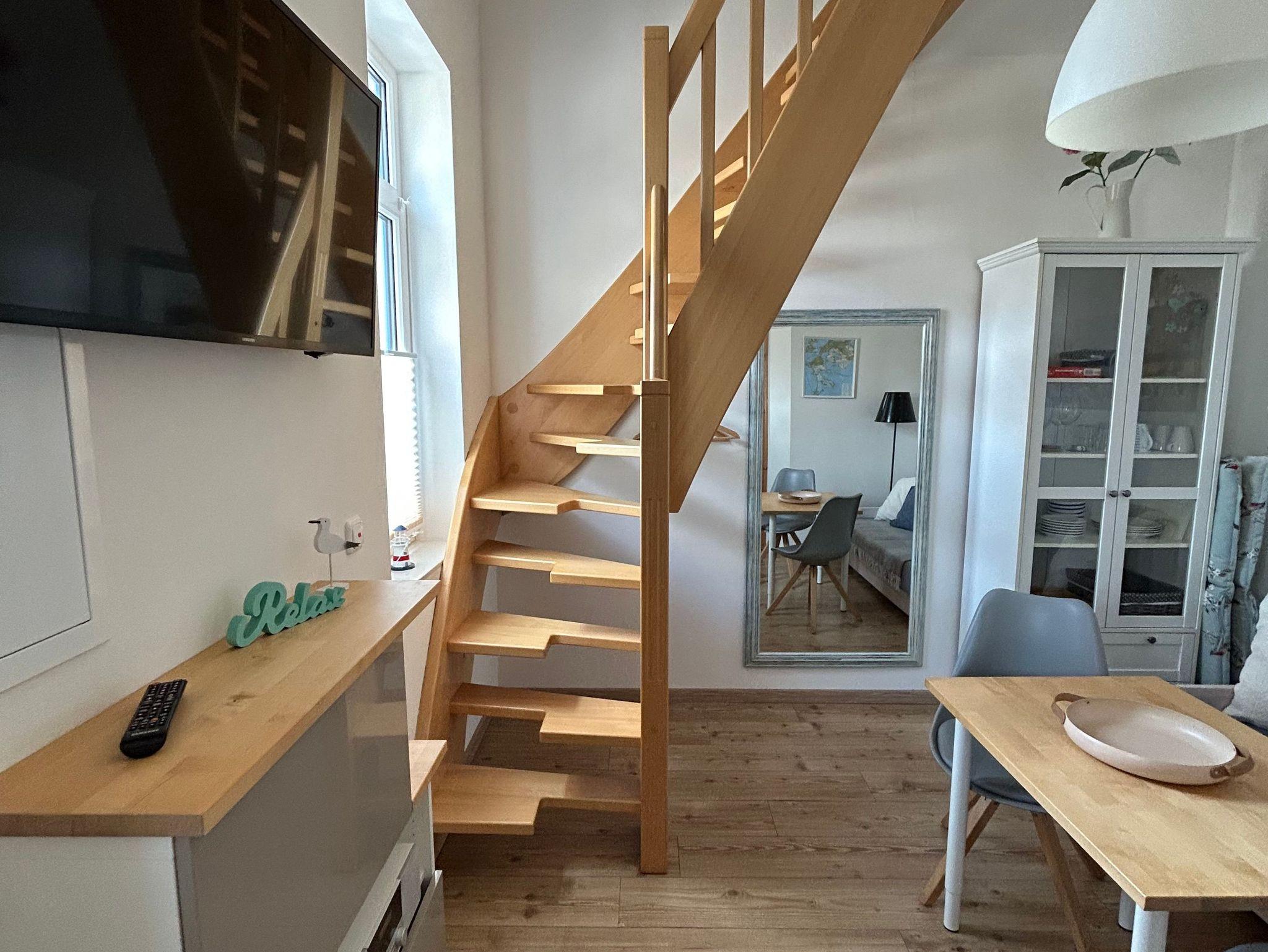 Unsere kleine, modern und liebevoll eingerichtete Ferienwohnung ist ca. 27 qm groß und bietet Platz für maximal 2 Personen. Im Wohnraum, der sich im Erdgeschoss der Wohnung befindet, steht eine Sitzcouch mit Tisch, ein kleiner Esstisch mit Stühlen und weitere Kleinmöbel. Es sind ein TV Flachbildschirm, Radio/ CD und Internet vorhanden. Die kleine Pantryküche ist mit einem mobilen Platten-Herd, Mikrowelle, Wasserkocher, Kaffeeglasfilterkanne, Kaffeemaschine, Toaster, Teekanne und Kühlschrank ausgestattet. Über eine Raumspar-Holztreppe gelangt man in das im Obergeschoss befindliche Schlafzimmer (keine Zwischentür). Hier stehen ein bequemes Doppelbett mit Nachttischen und Leselampe sowie ein Ablageschrank. Die Terrasse ist mit Tisch, Stühlen, Auflagen und Sonnenschirm ausgestattet. Auf Wunsch stellen wir auch einen kleinen Grill bereit.