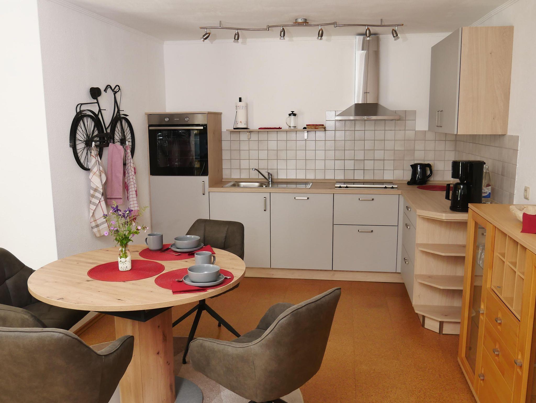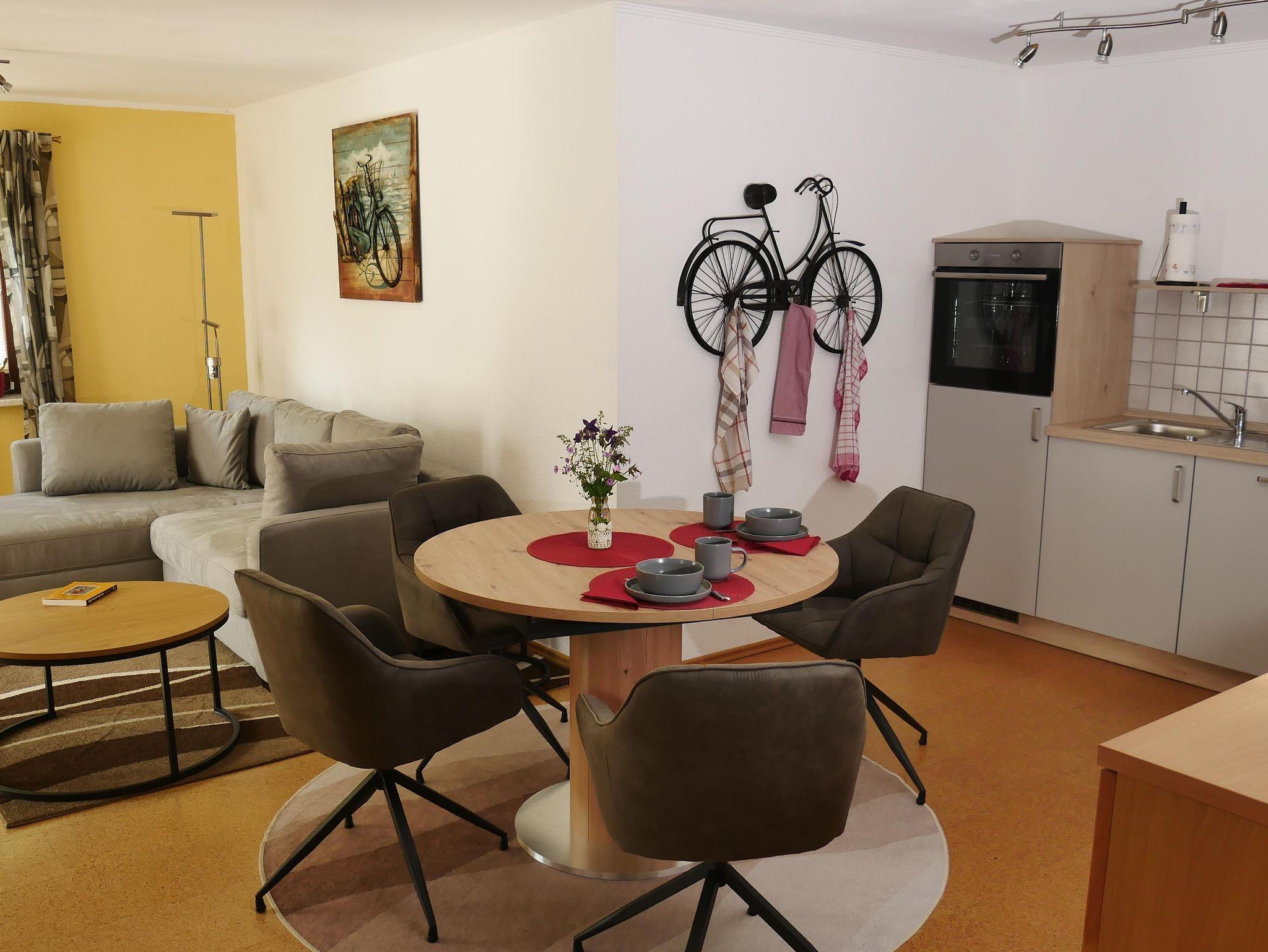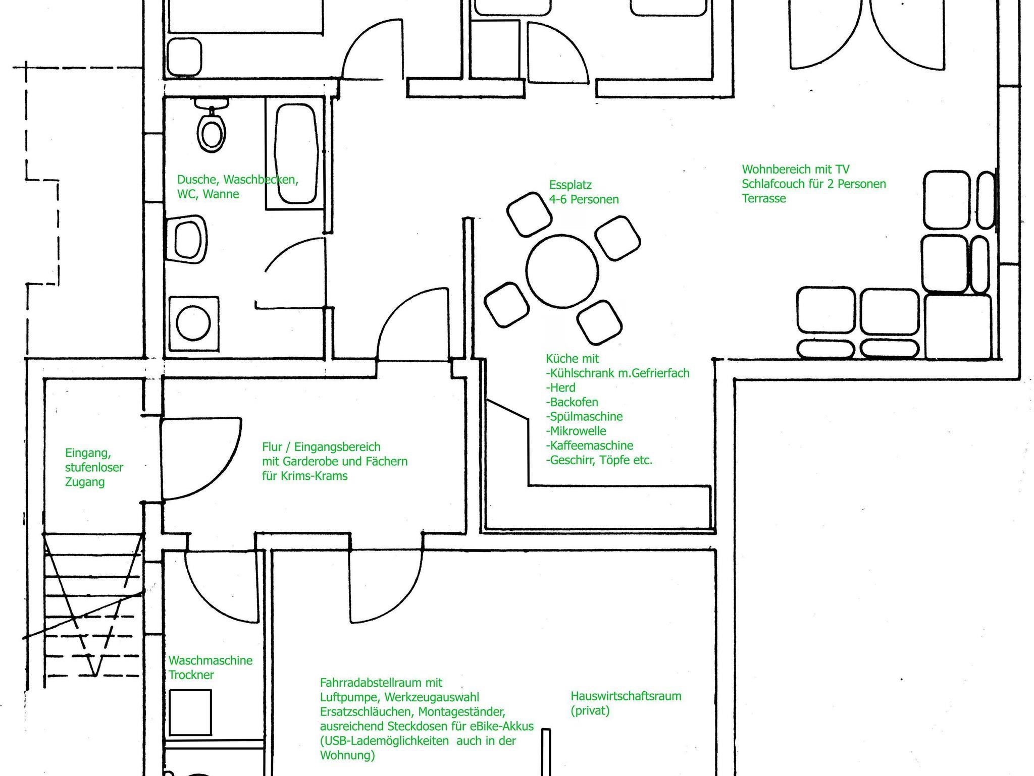 Ferienwohnung mit Wohnküche inklusive Essbereich und gemütlicher Sofa-Ecke, Sat-TV, WLAN, 2 Doppelzimmer, Dusche/WC, Terrasse, Fahrradraum mit Werkzeug und Trockenmöglichkeit