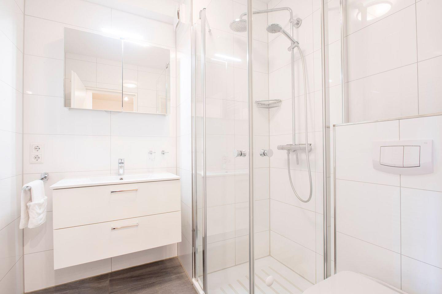 Sie ist für 3 oder 2 Personen und Kleinkind im Kinderbett geeignet und begrüßt Sie in modernem, gemütlichem Ambiente. In der 45 Quadratmeter großen FeWo auf Langeoog finden Sie alles, was Sie alleine oder zu zweit auf Ihrer Ferieninsel benötigen. Sie liegt im Hochparterre und bietet im Eingangsbereich einen kleinen Flur mit Garderobe. Von dort aus kommen Sie geradeaus in das neu gestaltete, helle Bad mit bodengleicher Dusche, WC und Waschtisch.