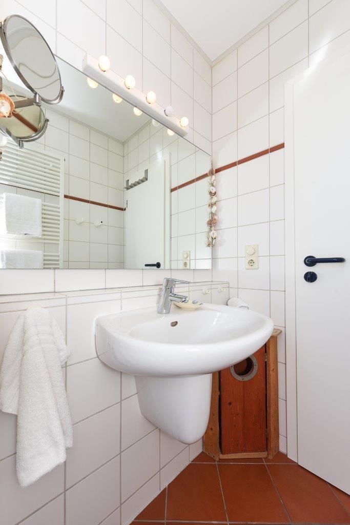 verfügen jeweils über eine Dusche, einen Waschtisch und ein WC. Das Bad im Obergeschoss hat zusätzlich ein Bidet. Das gemütliche Ferienhaus,