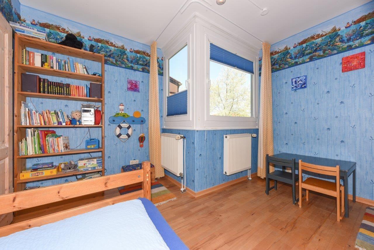 Zusätzlich haben Sie Zugang zum circa 40 Quadratmeter großen Garten sowie einer großen Spielwiese vor dem Haus. Im Obergeschoss finden Sie zwei