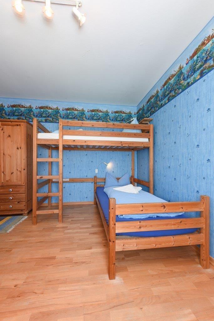 Schlafzimmer mit jeweils großen Doppelbetten (200x200 cm). Im Kinderzimmer gibt es ein Etagenbett und ein Kinderbettchen. Die beiden hellen Badezimmer