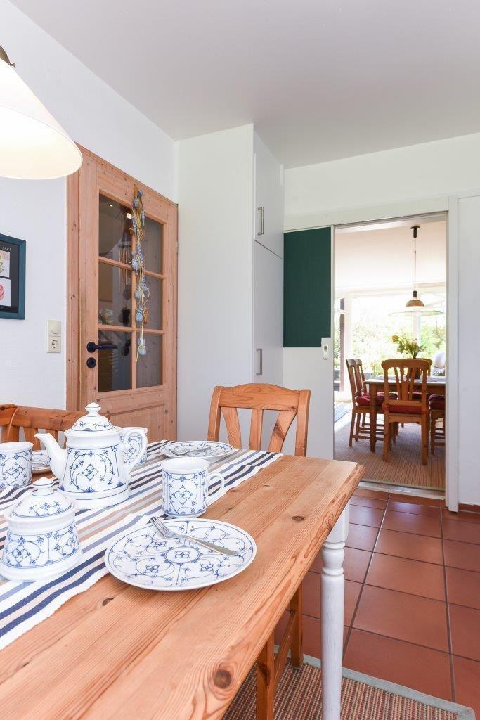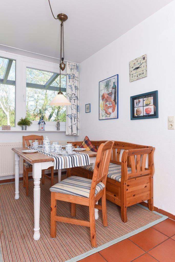 Die vollausgestattete Küche ist mit einer gemütlichen Sitzecke zum Frühstücken versehen. Sie schließt an den großen Wohnbereich mit