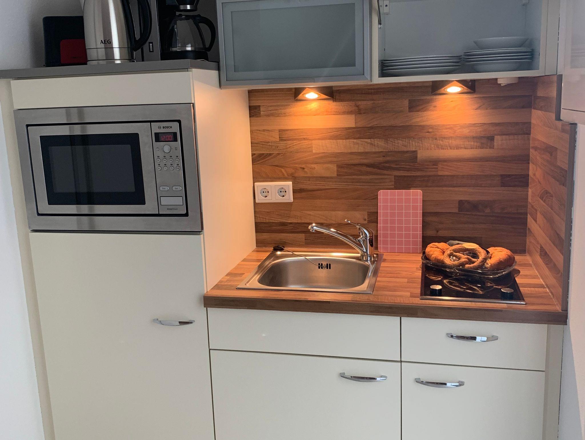 Die Küchenzeile ist vollausgestattet mit Mikrowelle, Herd, Kühlschrank, Kaffeemaschine, Geschirr und lädt ein zu gemütlichen Kochabenden.