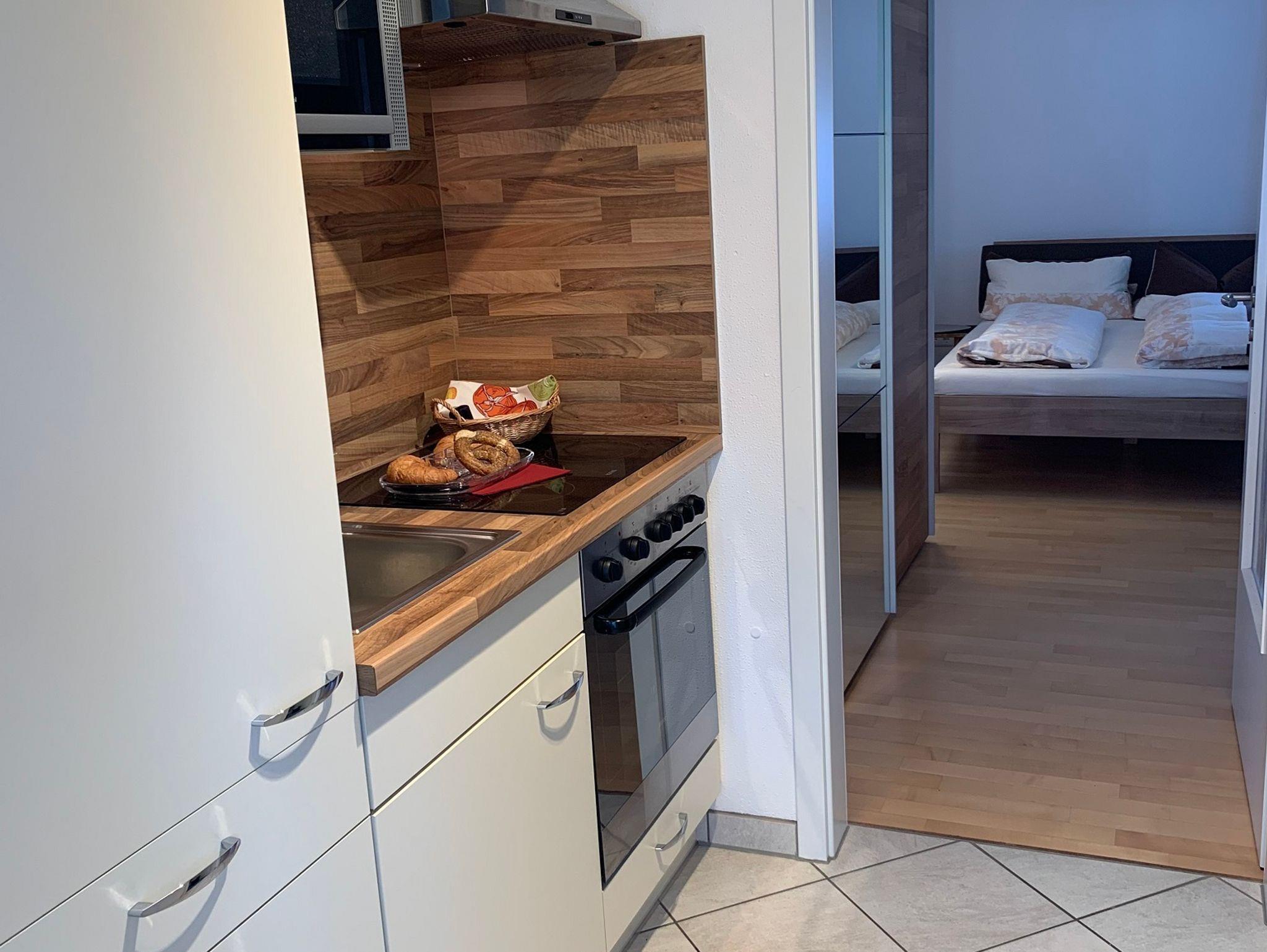 Die Küchenzeile ist vollausgestattet mit Mikrowelle, Herd mit Backofen, Kühlschrank, Kaffeemaschine, Geschirr und lädt ein zu gemütlichen Kochabenden.