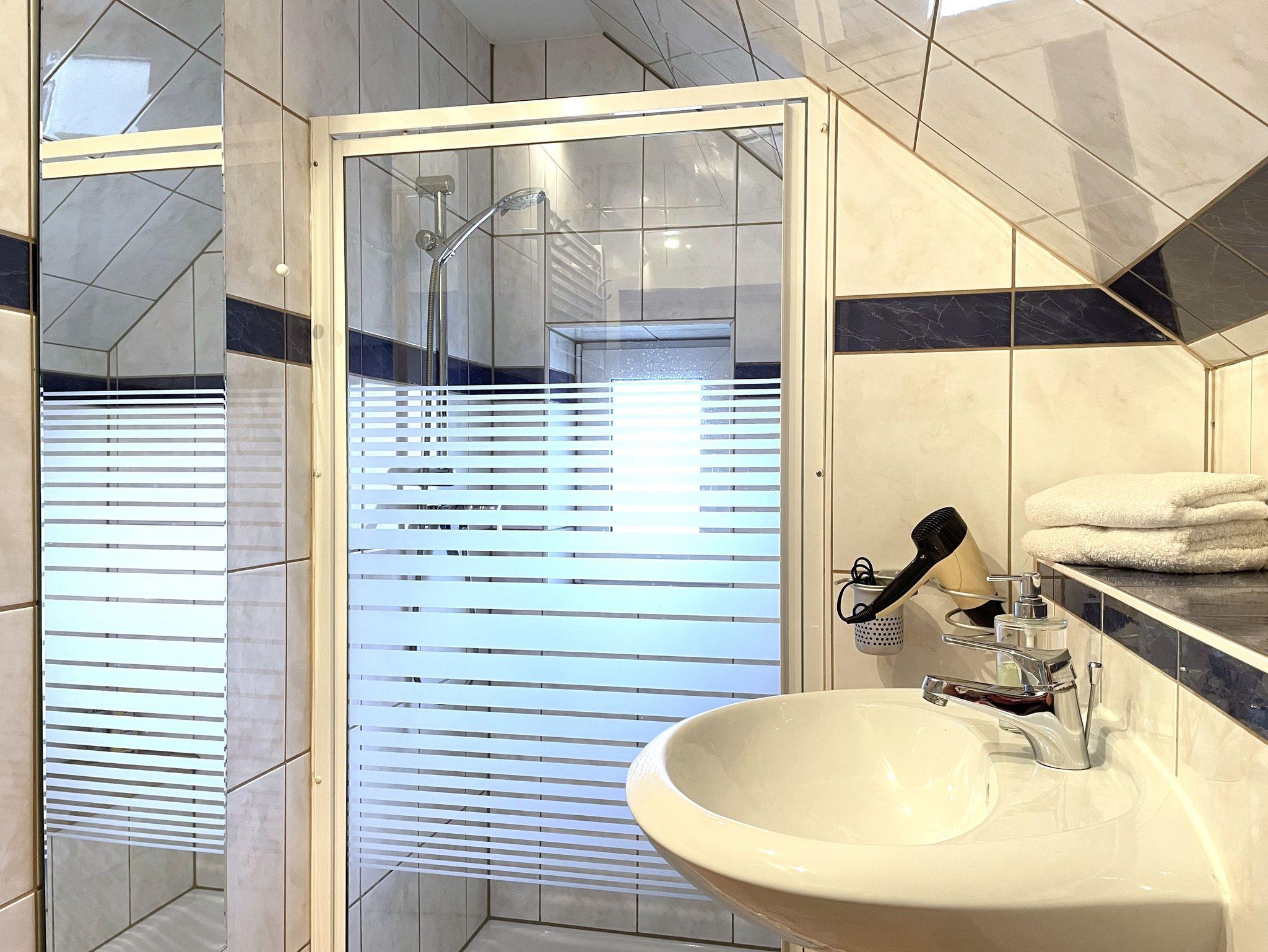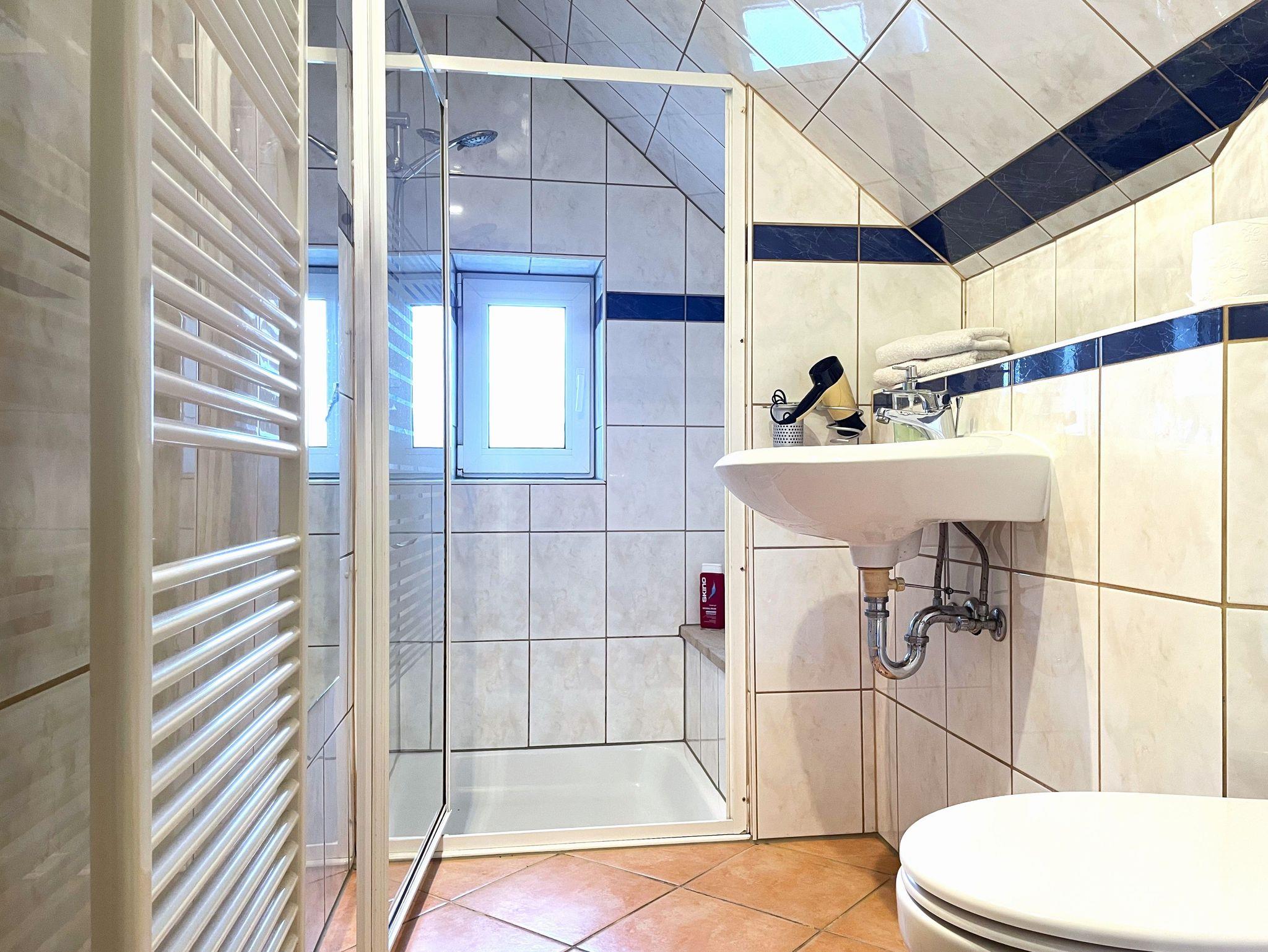 Das helle Bad ist modern ausgestattet mit einer begehbaren Dusche, Waschbecken und WC. Ein Handtuchwärmer und ein großer Ganzkörperspiegel runden den Komfort ab.