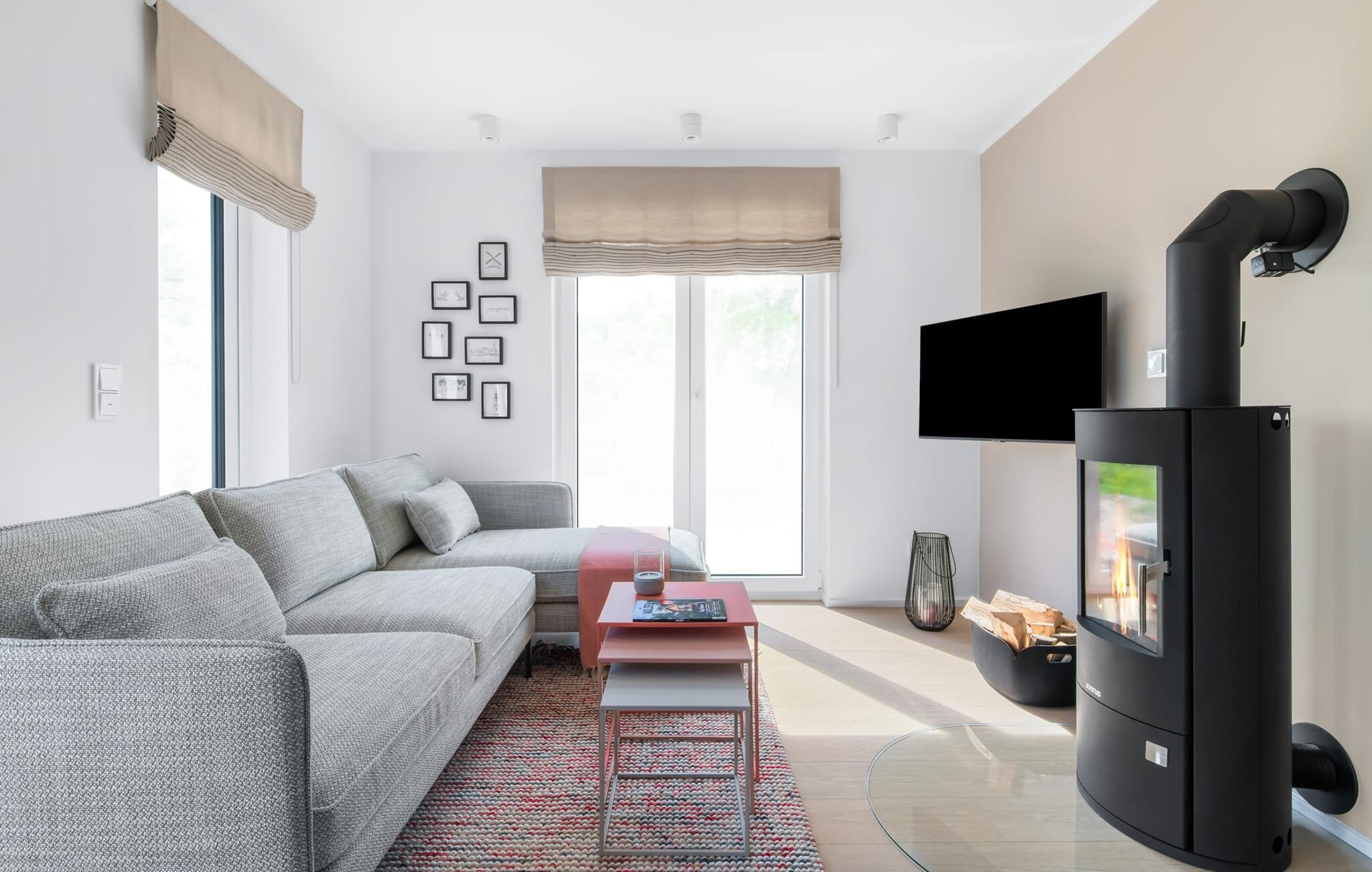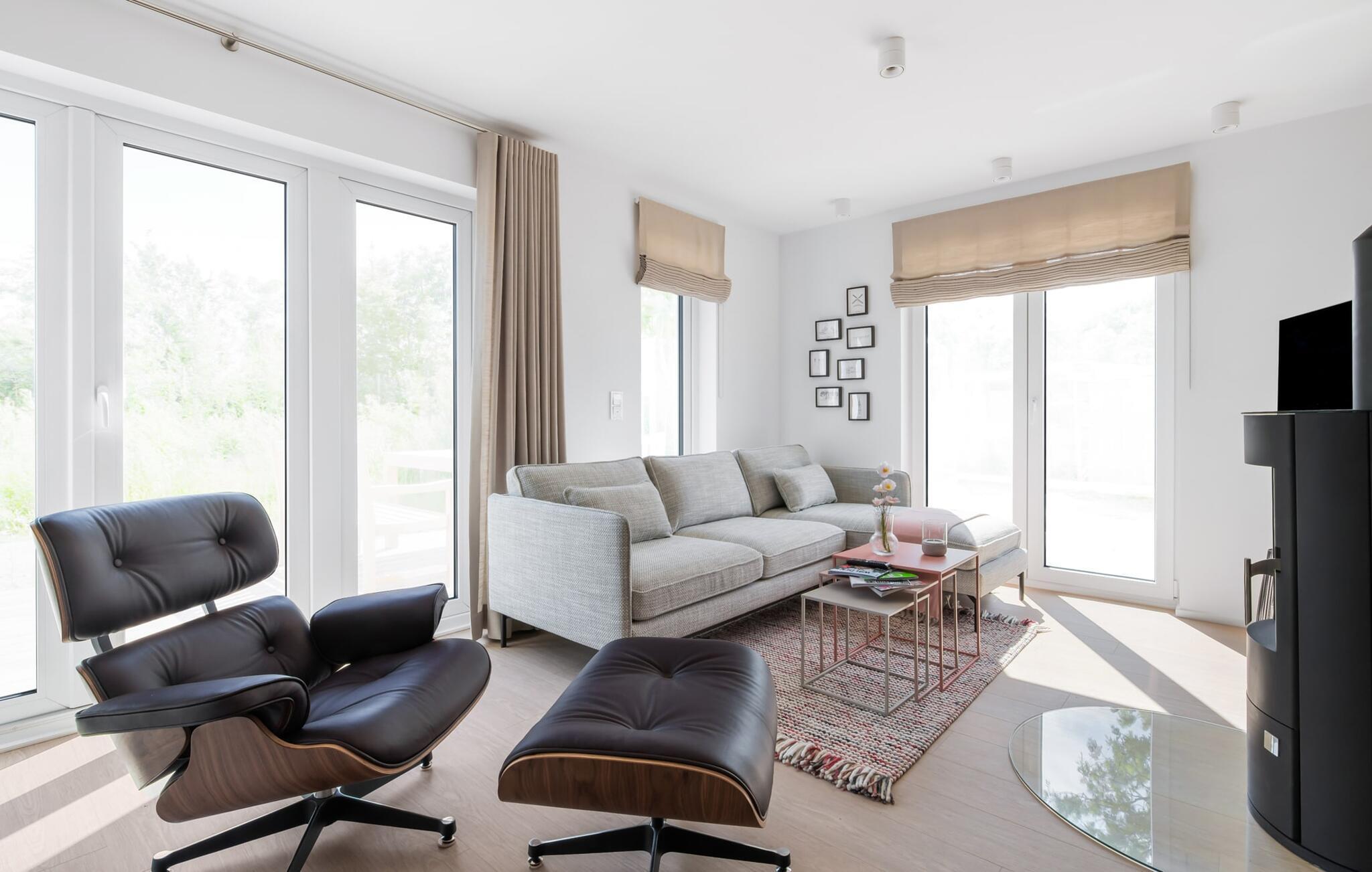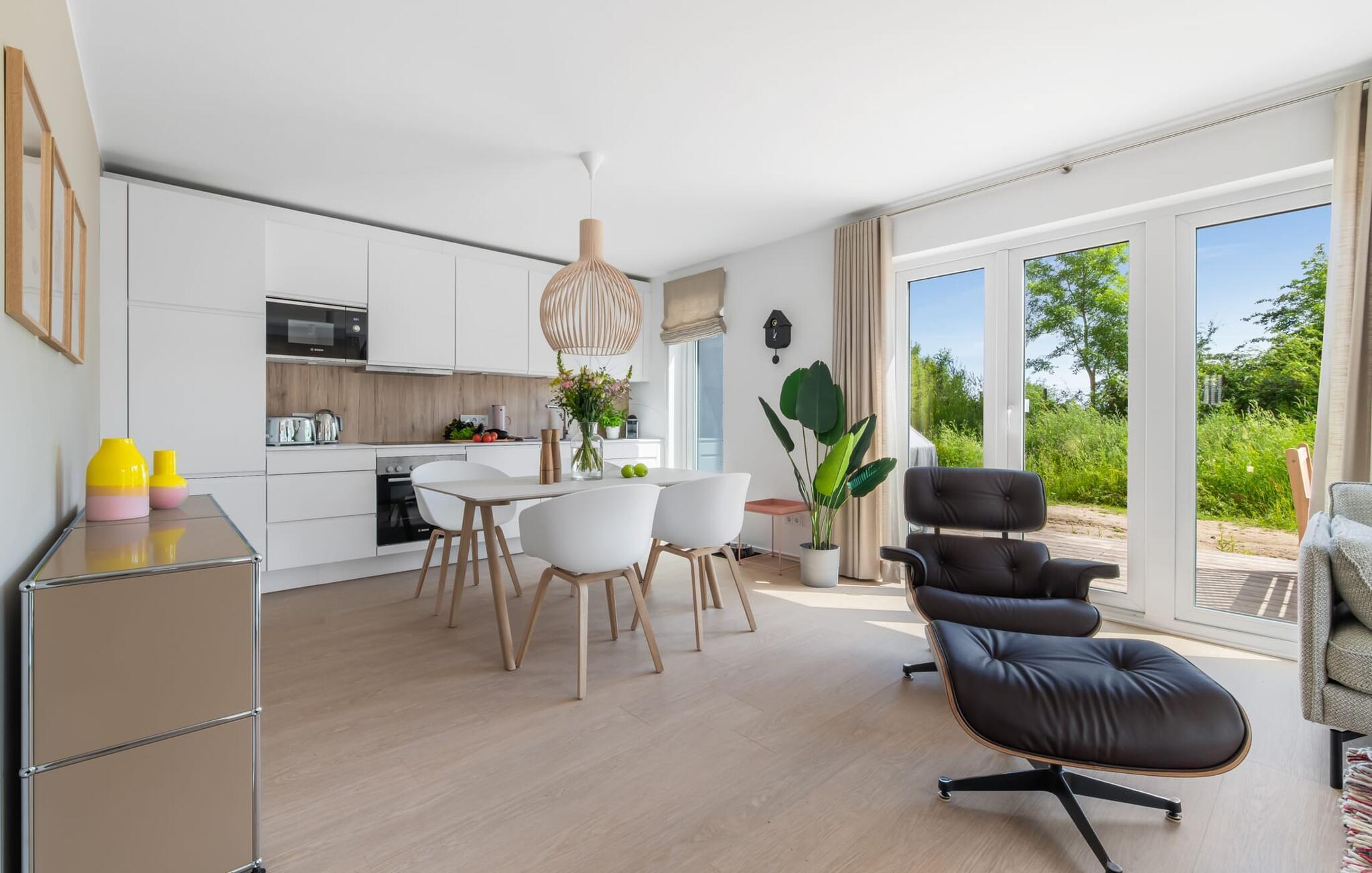 Die bodentiefe Fensterfront und die angrenzende großzügige süd-west Terrasse sind neben dem offenen Wohn-/Essbereich das Herz der Wohnung. Hier hineinkommen und sich sofort zu Hause fühlen ist eins. Auf der gemütlichen Couch zu entspannen, aus dem Fenster die Ruhe der Natur genießen oder fernzusehen ist Entspannung und Erholung pur. Und wenn die Ostsee sich sonnig von ihrer besten Seite zeigt, lädt die LAZY DAYS Terrasse mit komfortablem Strandkorb ganztägig zum Genießen ein. Bei nordischem Wetter sorgt der Kaminofen mit seinem prasselnden Feuer für weitere Behaglichkeit.
