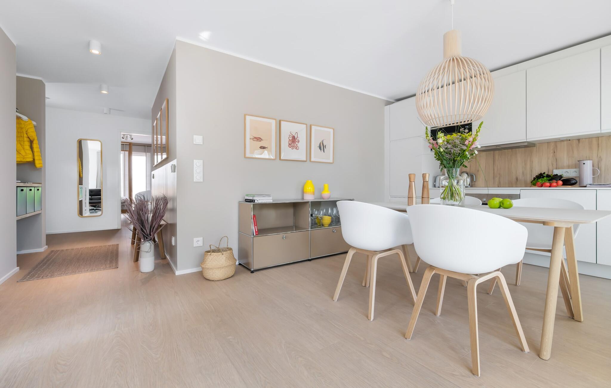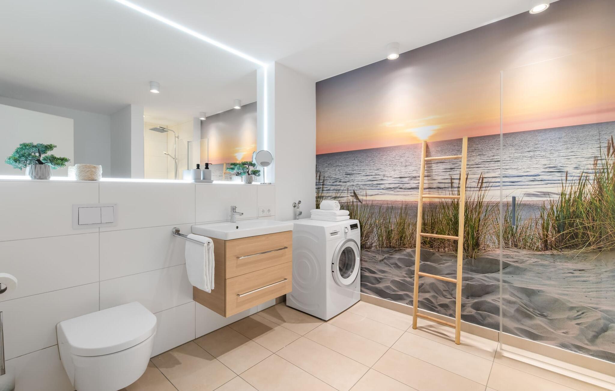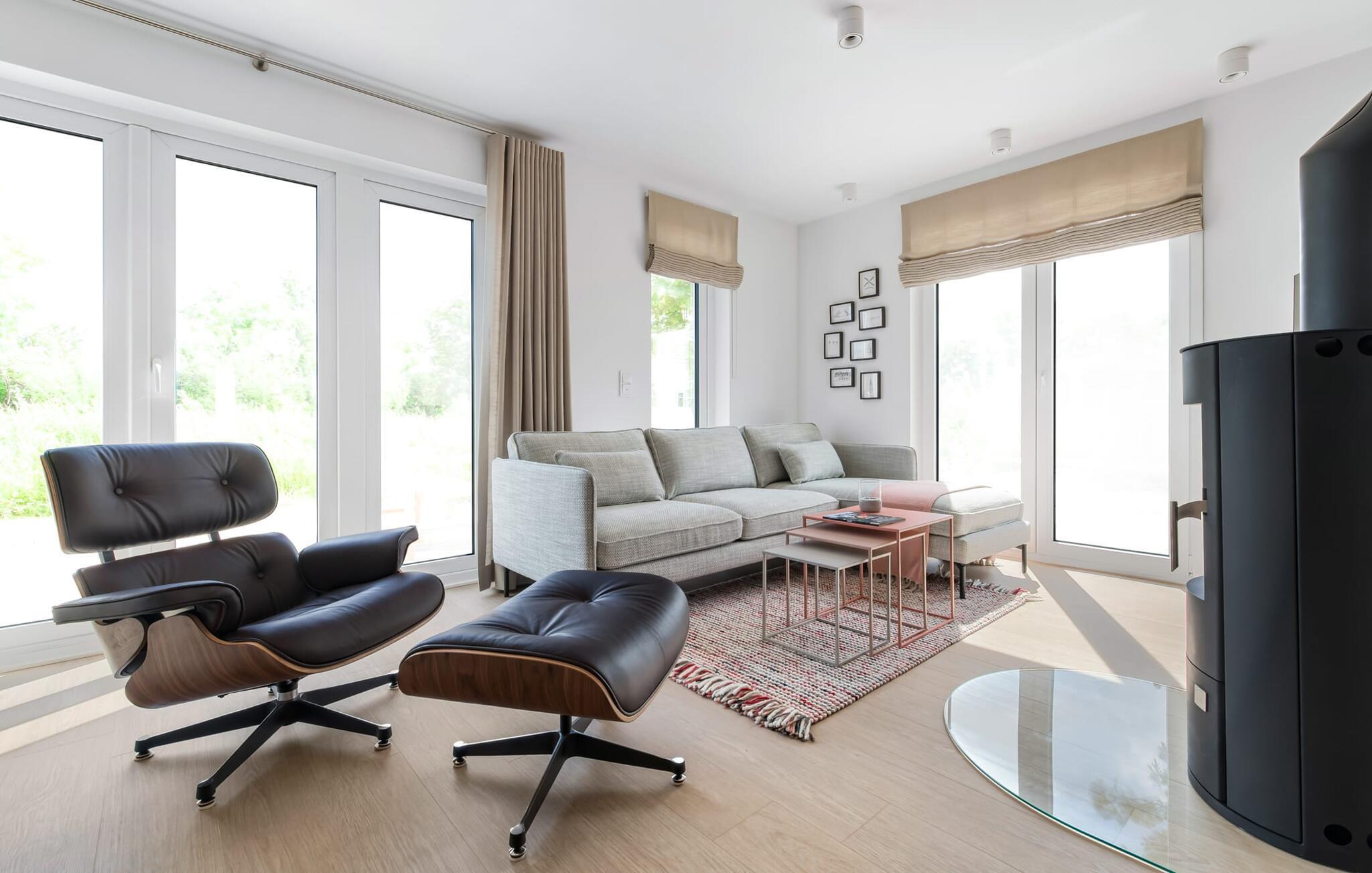 Die bodentiefe Fensterfront und die angrenzende großzügige süd-west Terrasse sind neben dem offenen Wohn-/Essbereich das Herz der Wohnung. Hier hineinkommen und sich sofort zu Hause fühlen ist eins. Auf der gemütlichen Couch zu entspannen, aus dem Fenster die Ruhe der Natur genießen oder fernzusehen ist Entspannung und Erholung pur. Und wenn die Ostsee sich sonnig von ihrer besten Seite zeigt, lädt die LAZY DAYS Terrasse mit komfortablem Strandkorb ganztägig zum Genießen ein. Bei nordischem Wetter sorgt der Kaminofen mit seinem prasselnden Feuer für weitere Behaglichkeit.