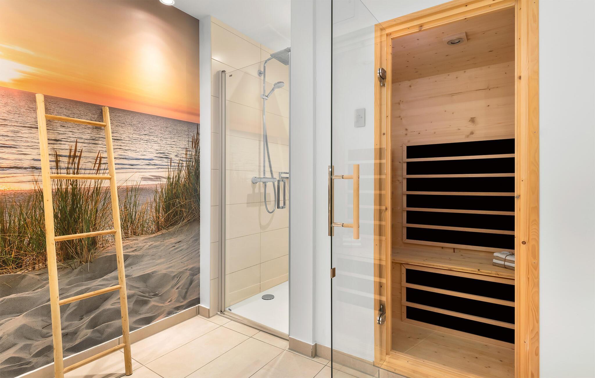 Das Duschbad mit bodengleicher Dusche und Sauna sorgt für unvergessliche Wellnessmomente