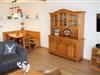 Das Wohnzimmer mit Essbereich liegt unmittelbar vor der Küche. Eingerichtet ist es mit großem Sofa, Fernseher, Radio und Leselampe.