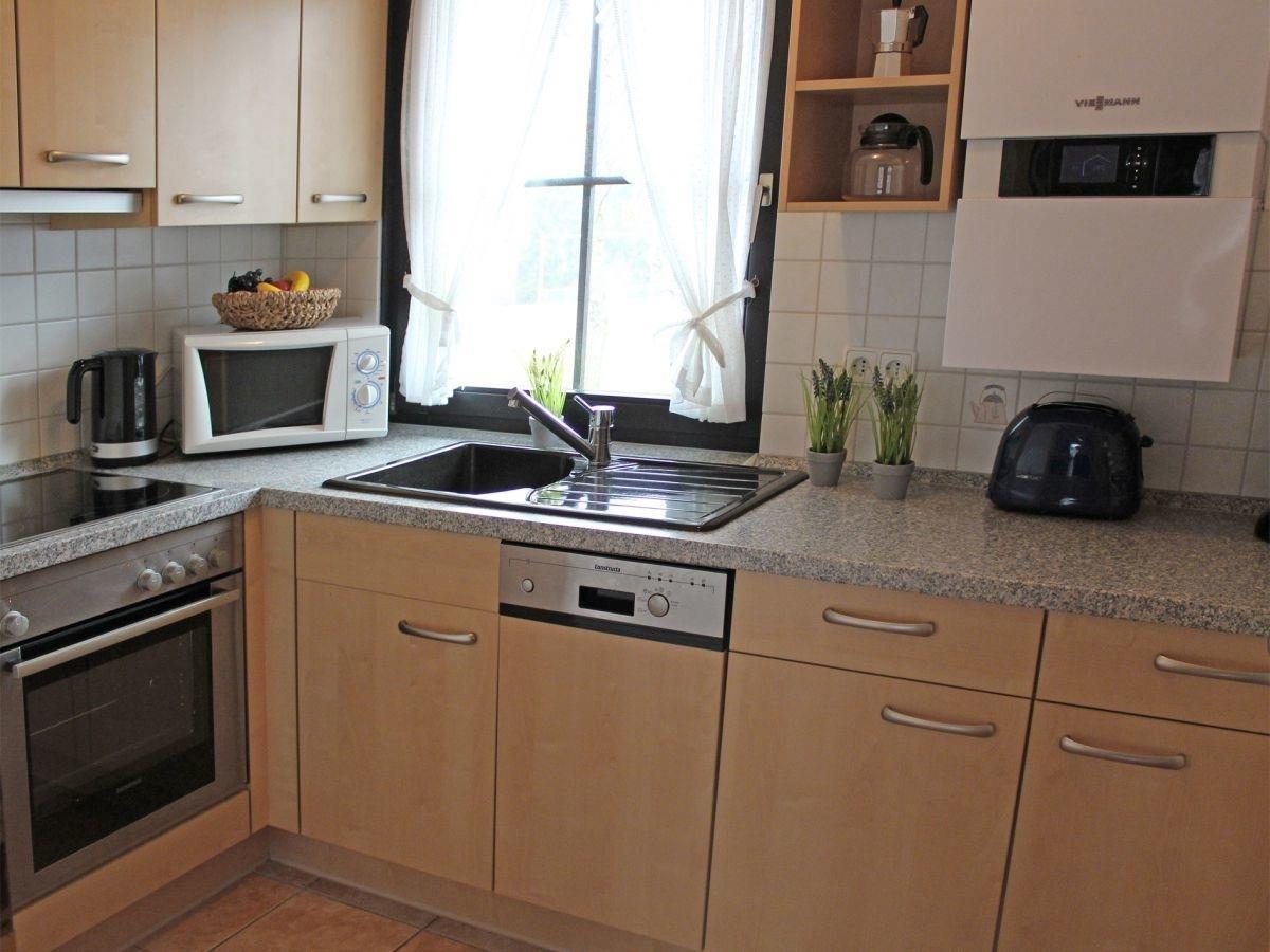 Voll ausgestattete Küche: Kühlschrank mit Gefrierfach, Herd (Ceranfeld), Dunstabzug, Geschirrspüler, Backofen, Wasserkocher, Toaster, Kaffeemaschine, Besteck, Geschirr, Gläser, Töpfe und alle gebräuchlichen Küchenutensilien.