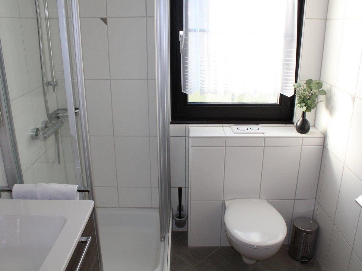 Das helle Badezimmer mit Tageslicht hat eine Dusche, ein Waschbecken, Spiegel und WC.