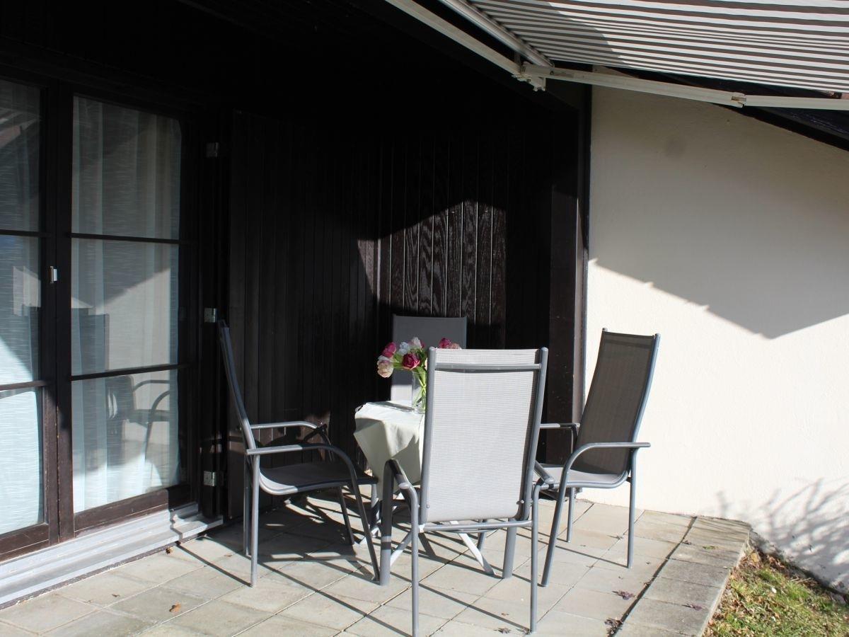 Die Terrasse ist möbliert mit einem Gartentisch und Stühlen, zwei Sonnenliegen sowie Markise als Sonnenschutz.