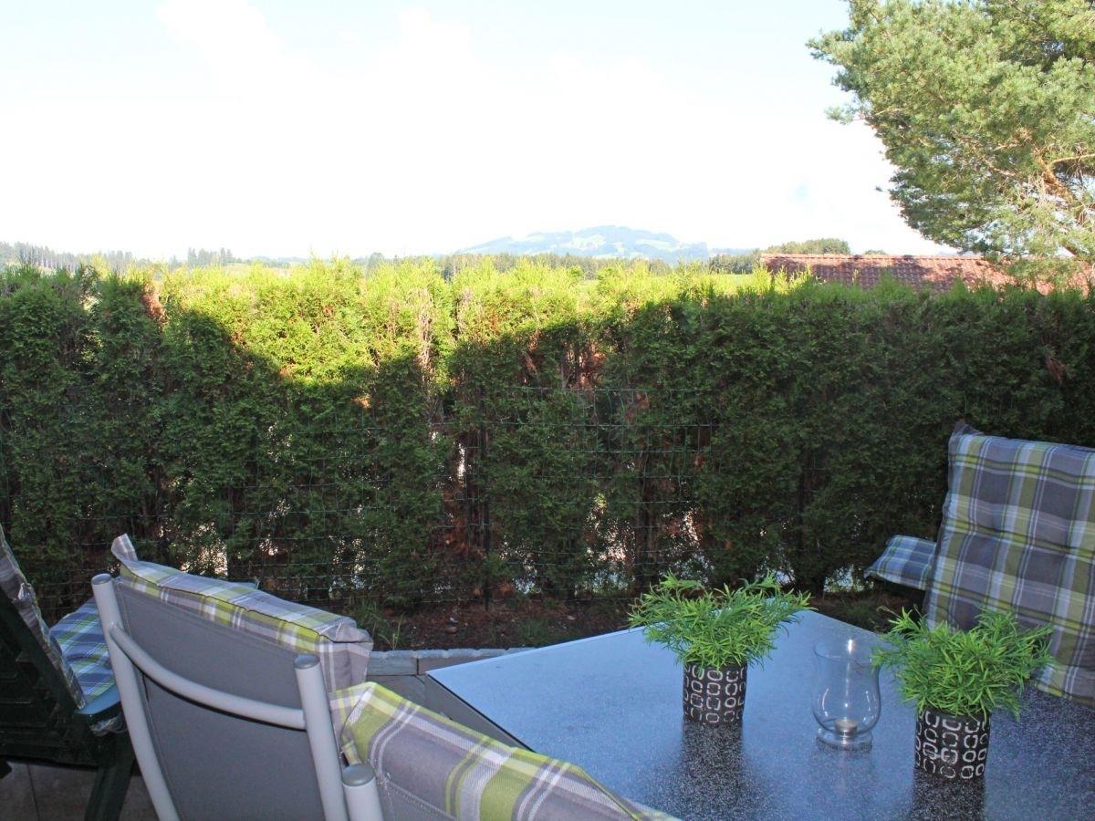 Die nach Westen ausgerichtete, nicht einsehbare Terrasse eröffnet einen herrlichen Ausblick auf den Auerberg und hat ab Mittag Sonne bis zum Untergang am Horizont.