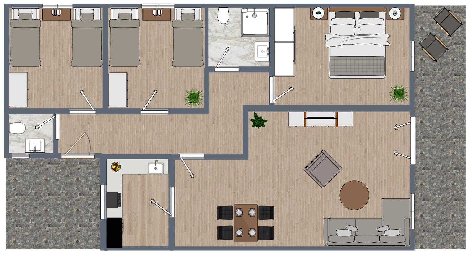 Das große Reiheneckhaus in südwestlicher Ausrichtung befindet sich in zentraler Lage im Feriendorf. Rezeption und Restaurant sind schnell erreichbar. Das Ferienhaus verfügt über einen ebenerdigen Zugang (keine Treppen). Das Haus kann mit bis zu 6 Personen belegt werden und bietet alles, was Sie für einen erholsamen Urlaub benötigen.