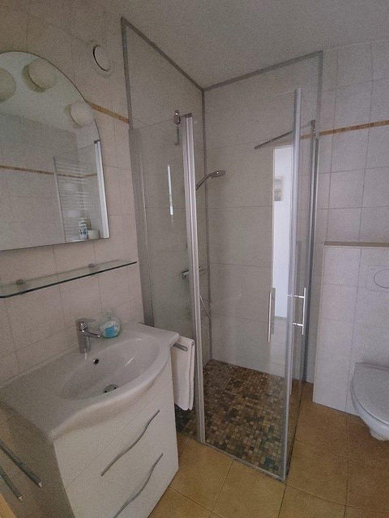 Dusche mit ebenem Einstieg, Waschbecken mit Unterschrank und WC