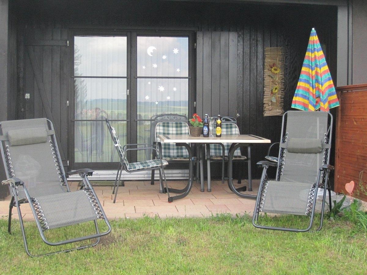 Die Süd-Ostterrasse ist möbliert mit einem Gartentisch und Stühlen, sowie zwei Sonnenliegen. Markise, ein Sonnenschirm und ein Grill sind vorhanden.