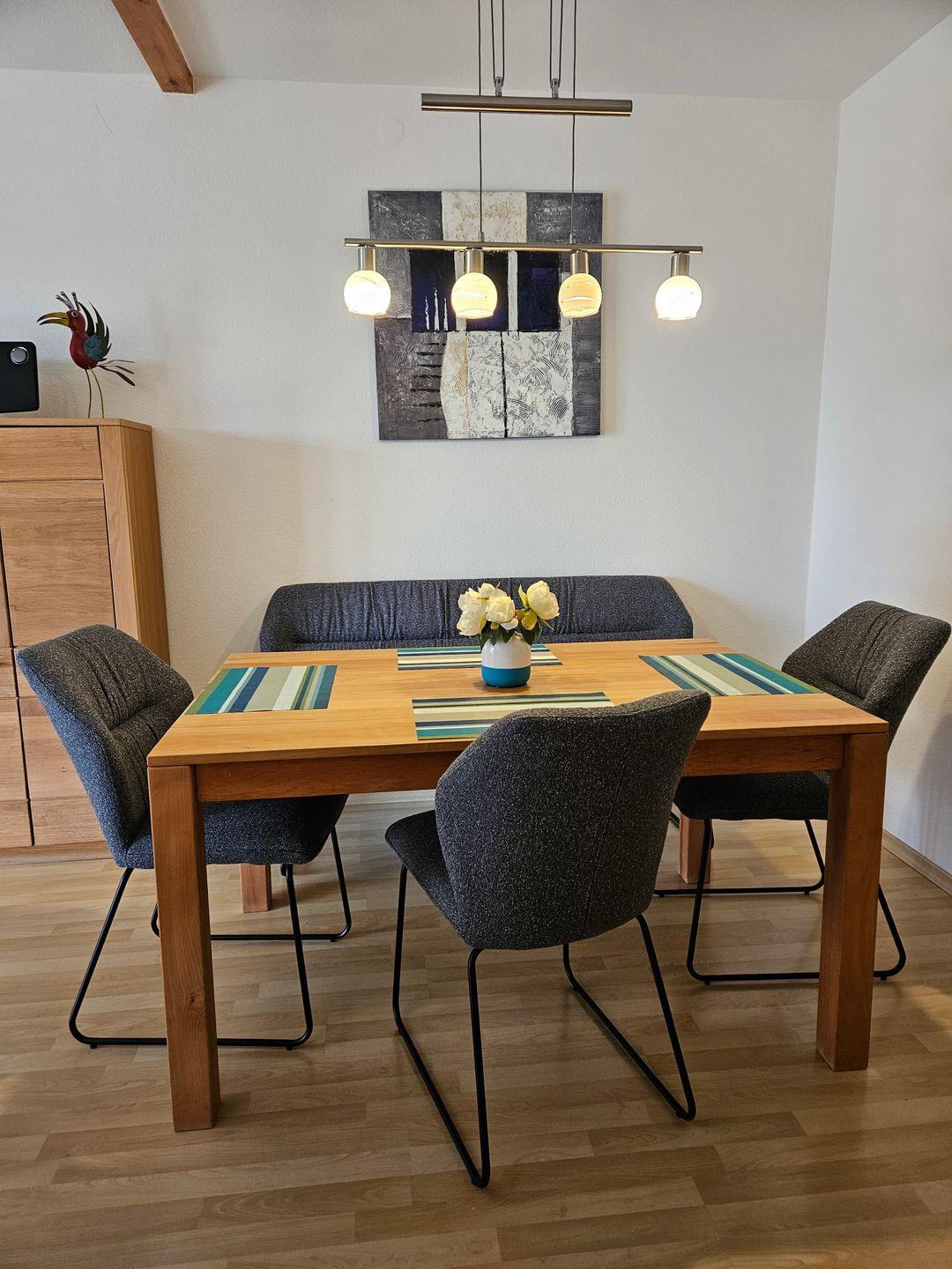 Im Inneren der Ferienwohnung erwartet Sie eine gemütliche und liebevoll gestaltete Ausstattung. Es stehen Ihnen zwei komfortable Schlafzimmer zur Verfügung, eines mit Doppelbett, eines mit zwei Einzelbetten und Ausziehmatratze für ein Kleinkind, ideal für eine erholsame Nachtruhe. Das Wohnzimmer mit Sofa und Essbereich ist der perfekte Ort, um gemeinsame Abende zu verbringen oder einfach die Ruhe zu genießen. Für Unterhaltung ist ebenfalls gesorgt – die Wohnung verfügt über zwei Fernseher sowie WLAN, sodass Sie auch während Ihres Urlaubs verbunden bleiben können.