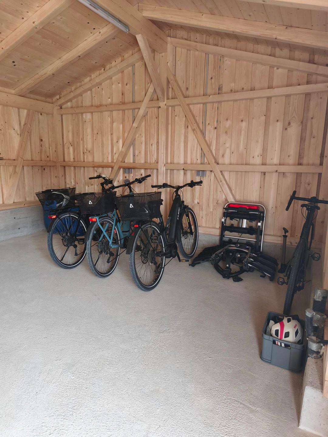 "Sicher parken und e-Bikes bequem laden: Unsere geschützte Fahrradunterstellmöglichkeit (Haus 72 - 75 ) bietet wetterfeste Stellplätze, 24/7 Zugang, Ladeanschlüsse für E-Bikes. Perfekt für Ihren Fahrradurlaub – sicher,